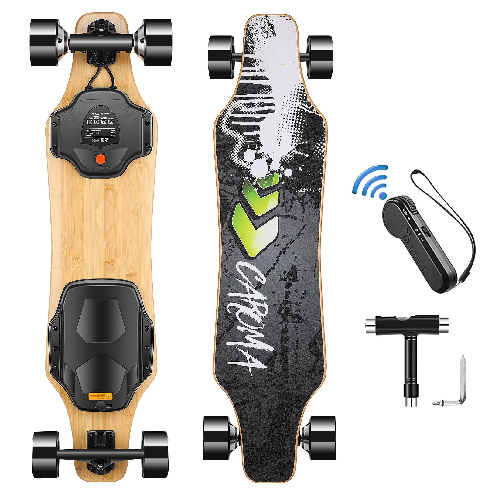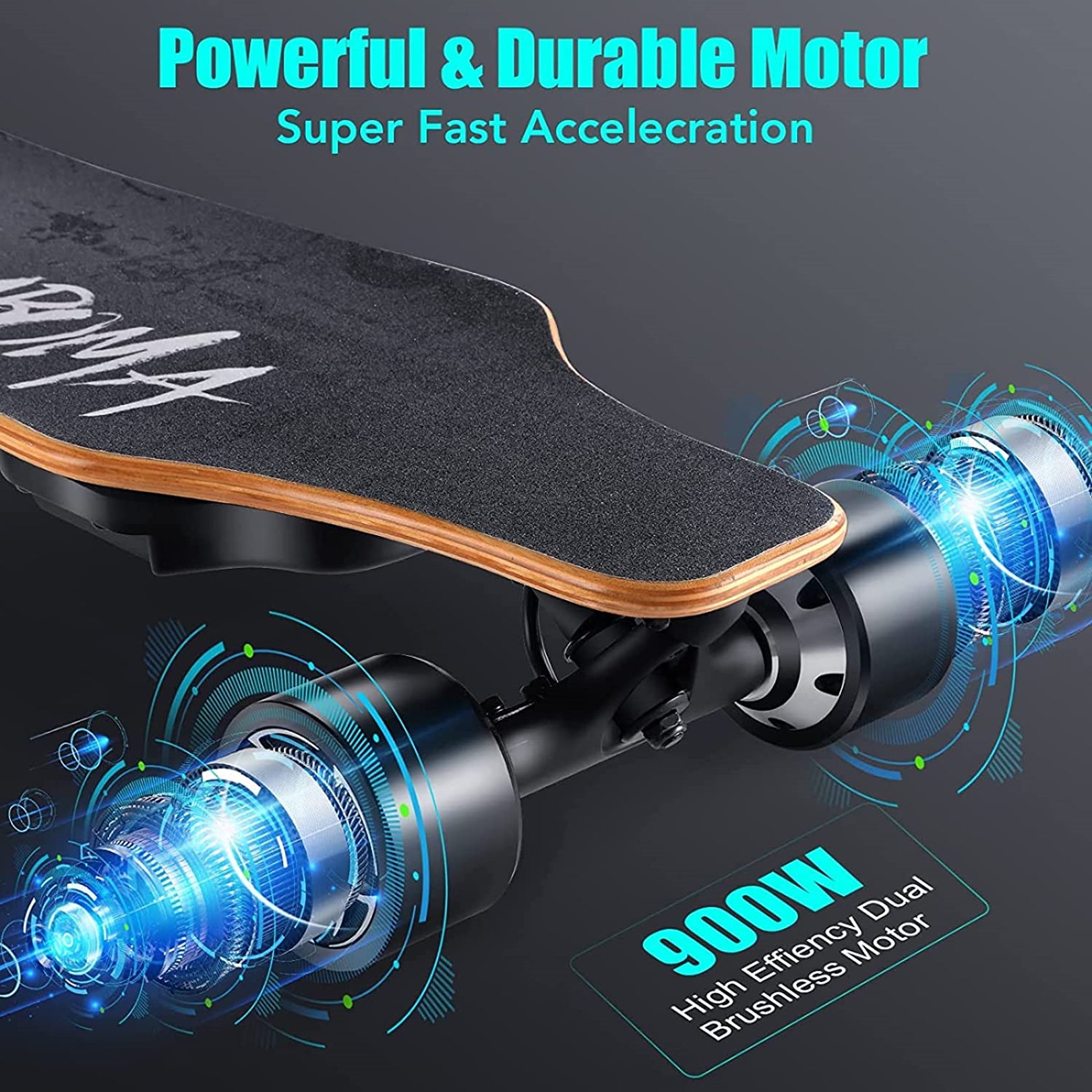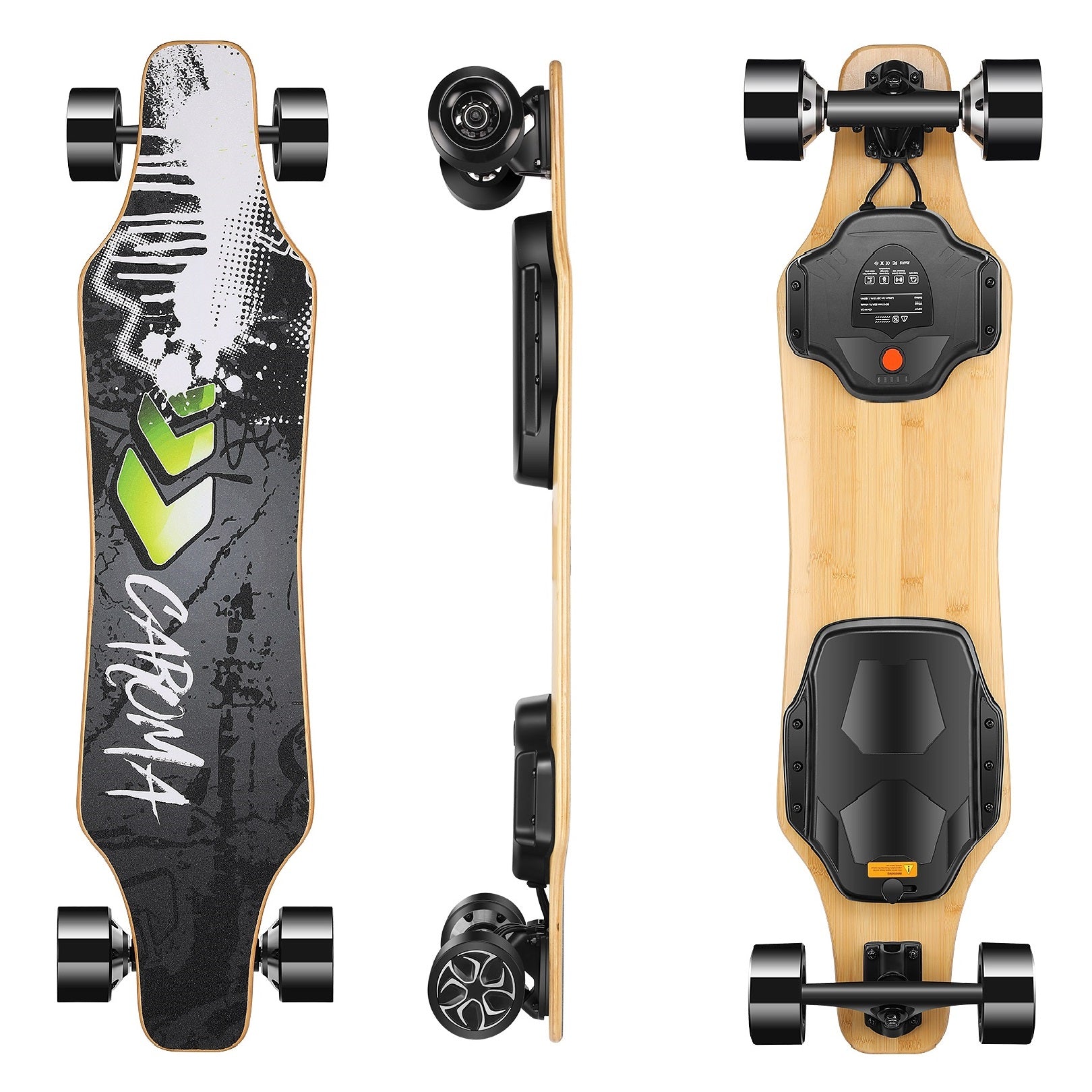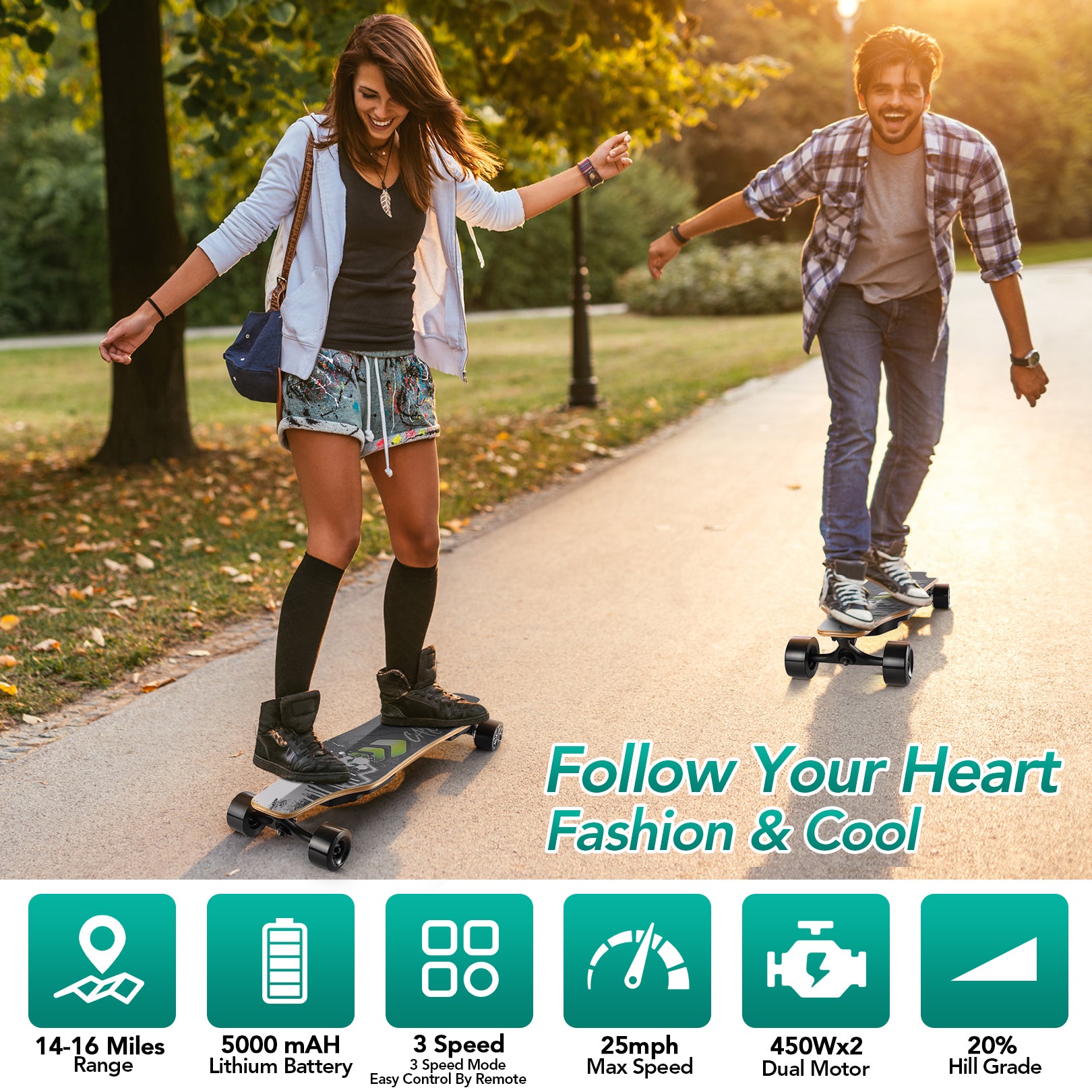 - [900W Powerful Dual Hub Motor] : Caroma 38" Electric Skateboard comes with 450W*2 powerful hub motors, that can adapt to diverse settings such as climbing hills, grass or riding inside the city with a top speed of 25 mph and range of 16 miles. With dual motors, it’s strong enough to climb a 25% steep hill.