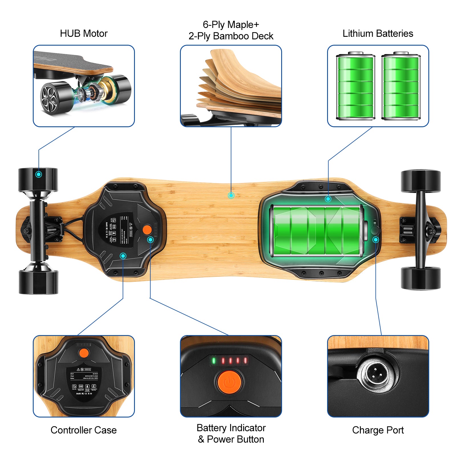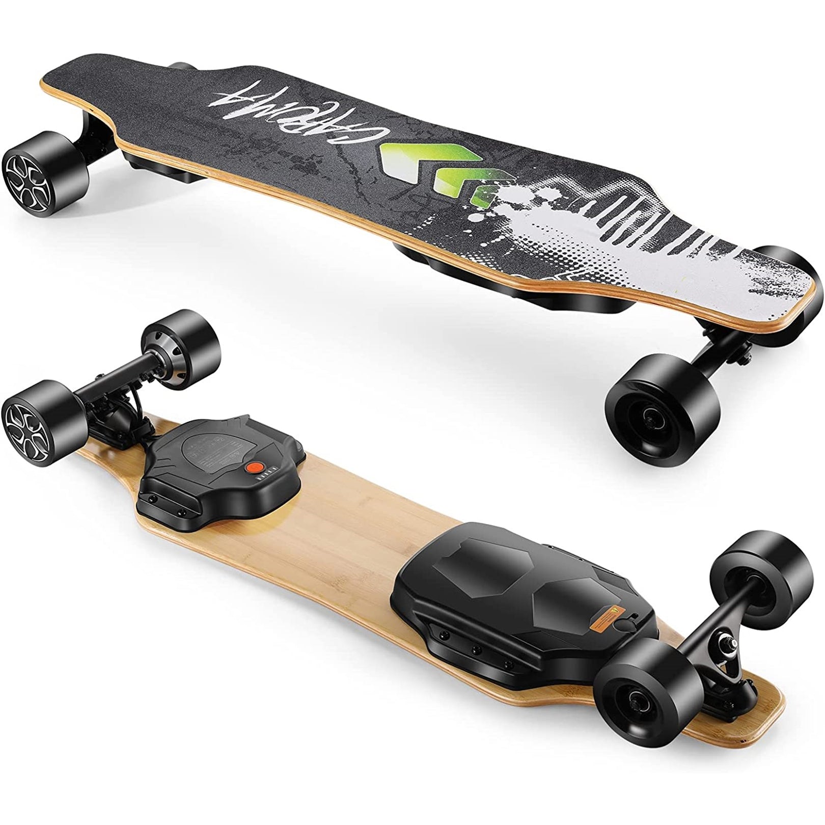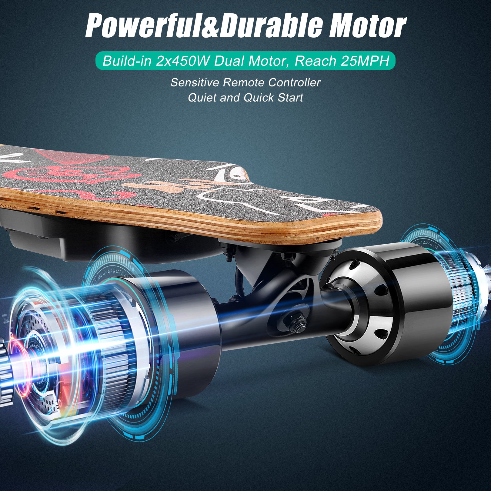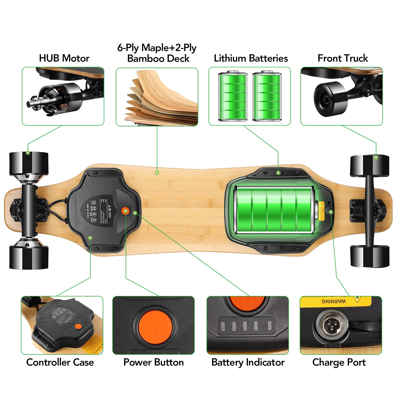 - [900W Powerful Dual Hub Motor] : Caroma 38" Electric Skateboard comes with 450W*2 powerful hub motors, that can adapt to diverse settings such as climbing hills, grass or riding inside the city with a top speed of 25 mph and range of 16 miles. With dual motors, it’s strong enough to climb a 25% steep hill.