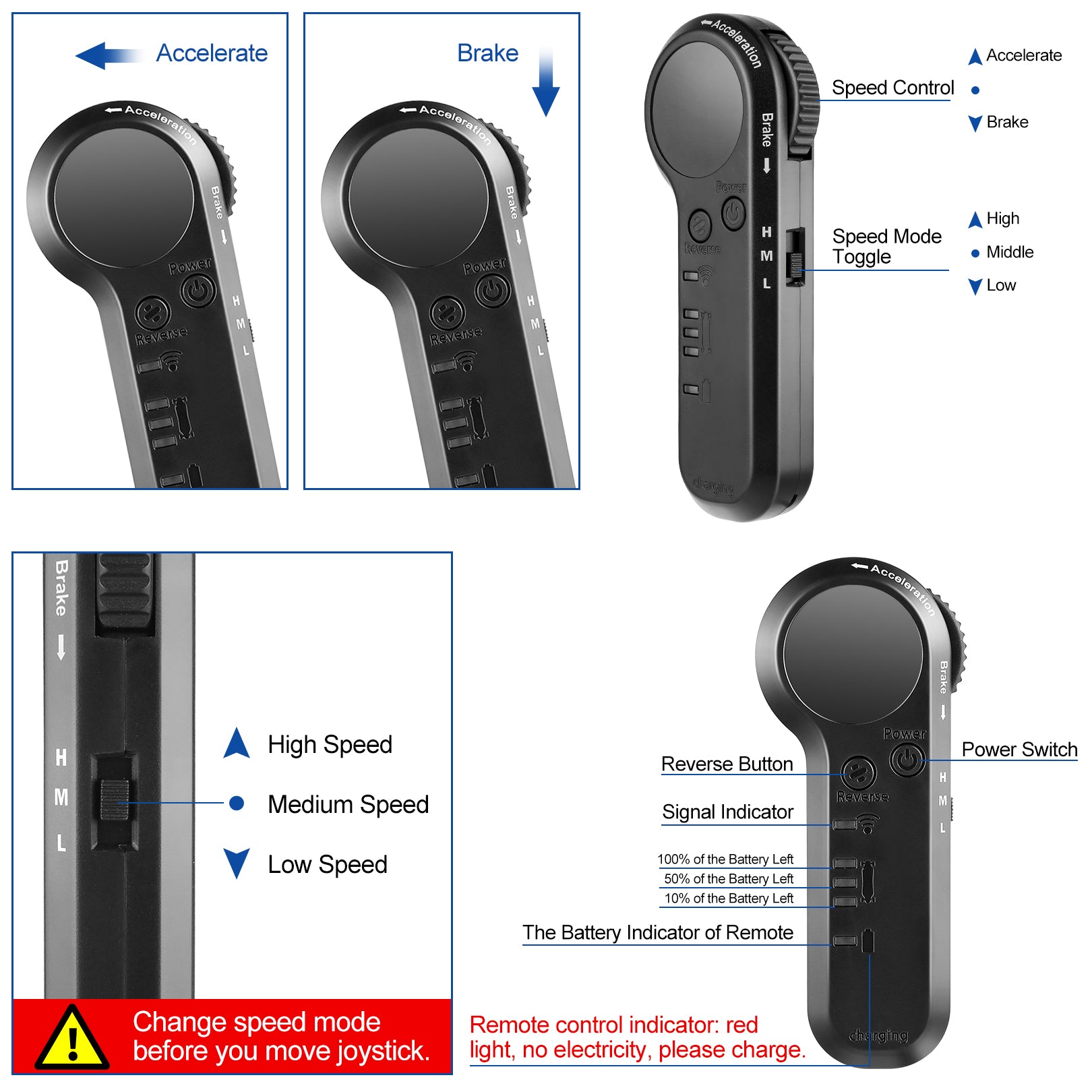 Please press and hold the brake button of the remote control while stepping on the skateboard, so that the skateboard will not slide forward when stepping on the skateboard, making it easier to stand and keep balance.