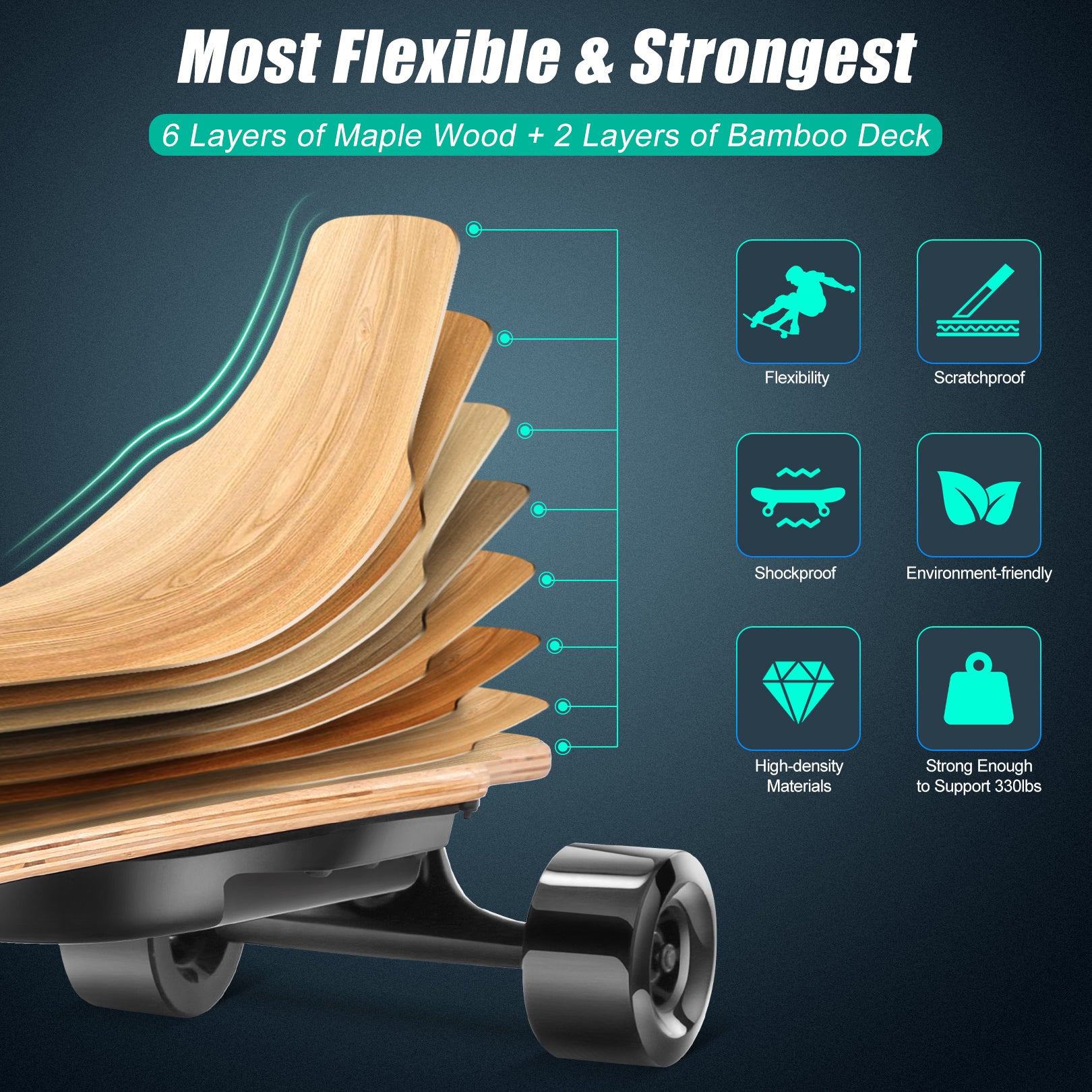 - [8-Ply Maple Deck & High-Grip Wheels] : This motorized skateboard is constructed of 8 layers of maple wood making to easily transport riders of up to 330lbs (150 kg); Durable, shock-absorbing 90 mm 85A PU wheels provide an unbelievably smooth riding experience.