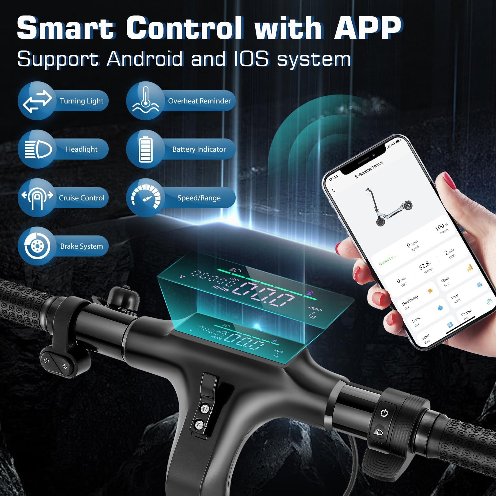 【Smart APP Control】Take control of your ride with the free "E-Scooter Home" APP, available for both iPhone and Android. Connect your adult electric scooter via Bluetooth and manage features such as lock/unlock, light control, gear adjustment, start mode selection, cruise control, and more. The smart APP enhances your riding experience and simplifies scooter operation.