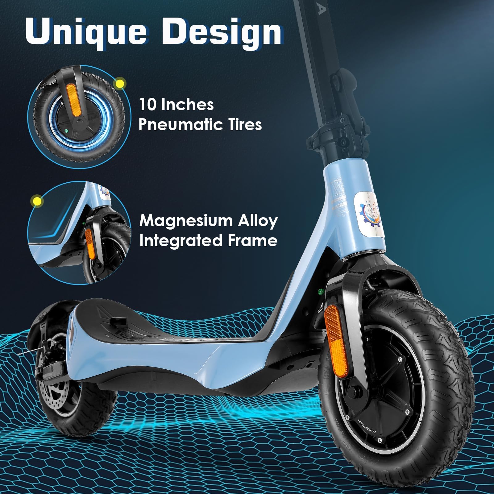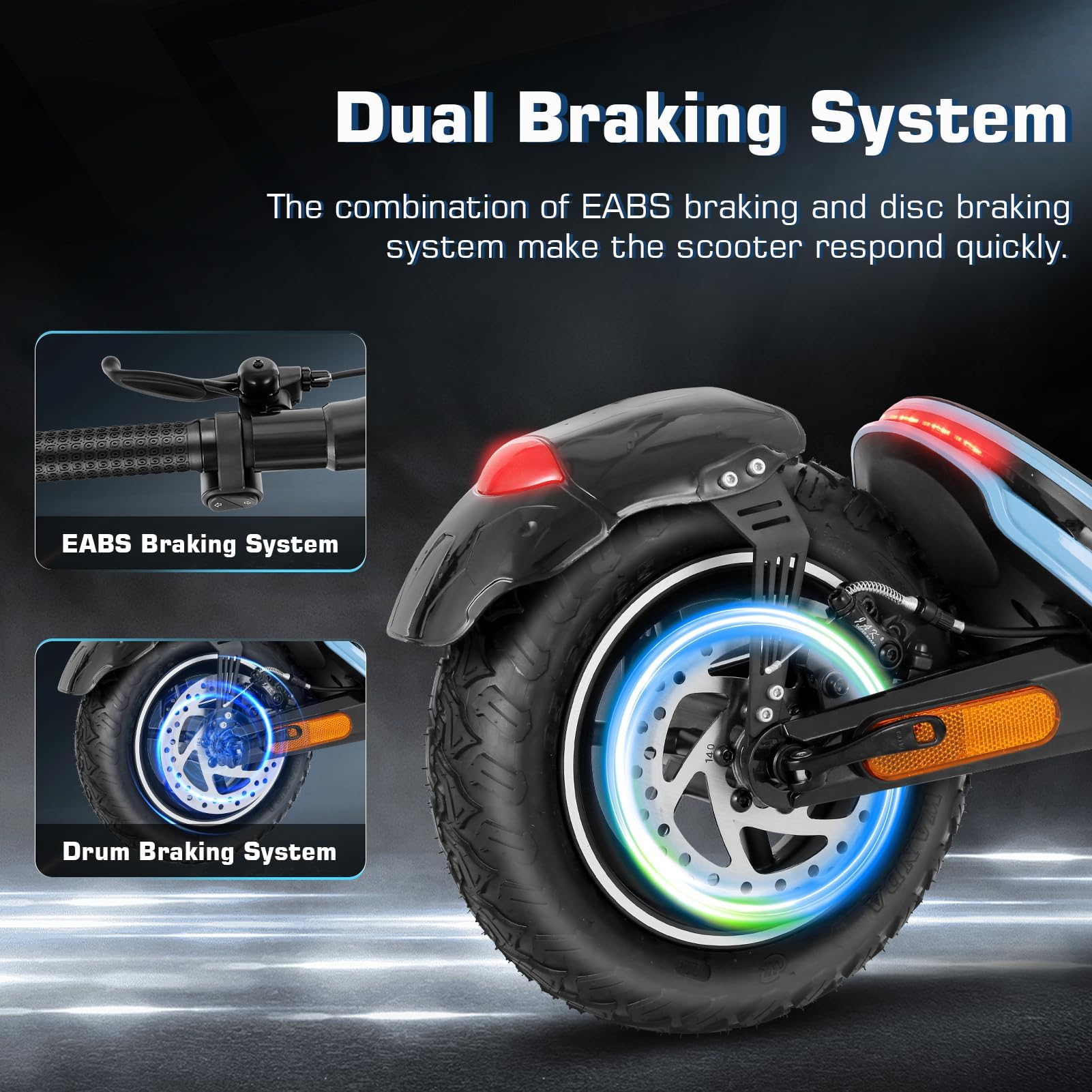 【High Coefficient of Safety Design】C1 adult electric scooter has a dual braking system,The combination of EABS braking and disc braking system make the scooter respond quickly. The 10-inch Off-Road Pneumatic Tubeless Tire is designed to handle a wide range of terrain, from city streets to dirt trails. The tires are made of a strong, special material that absorbs shock, prevents sharp objects like nails from hurting the tires, and ensures a smooth ride.