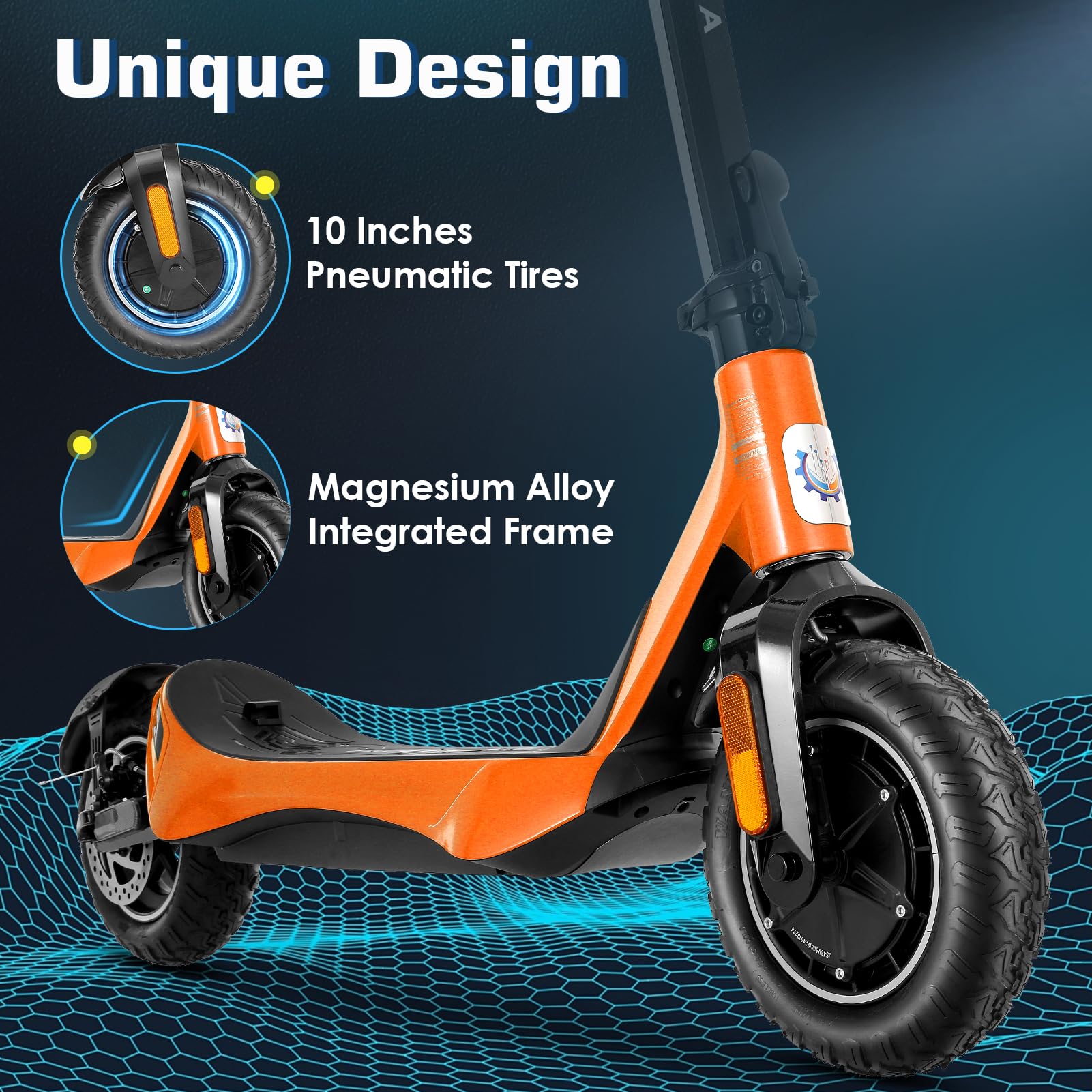 【High Coefficient of Safety Design】C1 adult electric scooter has a dual braking system,The combination of EABS braking and disc braking system make the scooter respond quickly. The 10-inch Off-Road Pneumatic Tubeless Tire is designed to handle a wide range of terrain, from city streets to dirt trails. The tires are made of a strong, special material that absorbs shock, prevents sharp objects like nails from hurting the tires, and ensures a smooth ride.