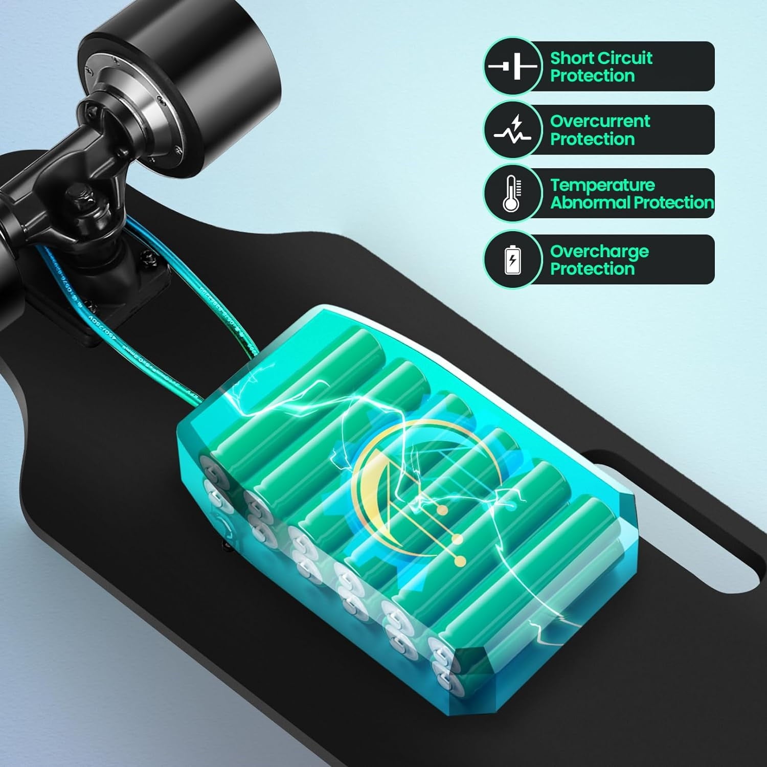 🏄♂️8-PLY MAPLE DECK : This electric longboard is made of 8 layers rock hard maple deck that has better flex, more stable and durable. 36 inches longboard, 9 inches wide, weighs 12.5 lbs and can hold a maximum load of 220 lbs. This maple longboard can withstand all kinds of stamping collisions without deformation. Recommended for ages 8+ kids, teens or adults.