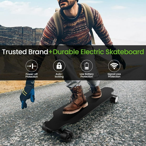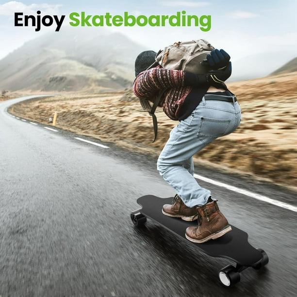 🏄♂️700W DUAL BRUSHLESS HUB MOTOR : This skateboard electric is equiped with 350W x 2 dual motor so that itcan accelerate up to 18.6 MPH and the ride is smooth and quiet. You can ride the cool longboard at low(6.21MPH),middle(9.32 MPH) or high(18.6 MPH) speed(Standard 15.6 MPH, Max 18.6 MPH). You can also ride it as a regular board without electricity.