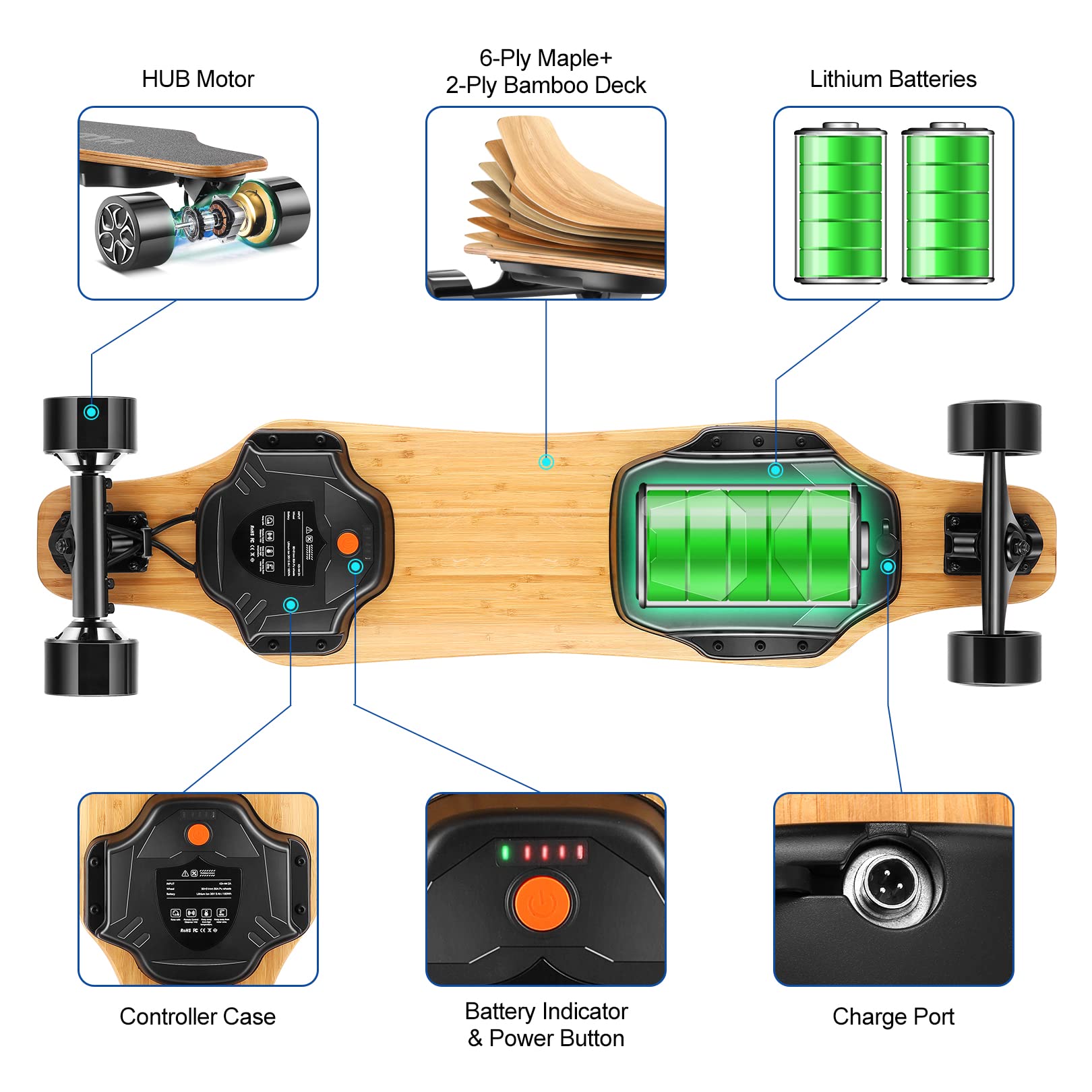 [900W Powerful Dual Hub Motor]: Caroma 38" electric skateboard comes with 450W*2 powerful hub motors, that can adapt to diverse settings such as climbing hills, grass or riding inside the city with a max speed of 28 mph (standard speed 25 mph). With dual motors, it’s strong enough to climb a 20% steep hill.