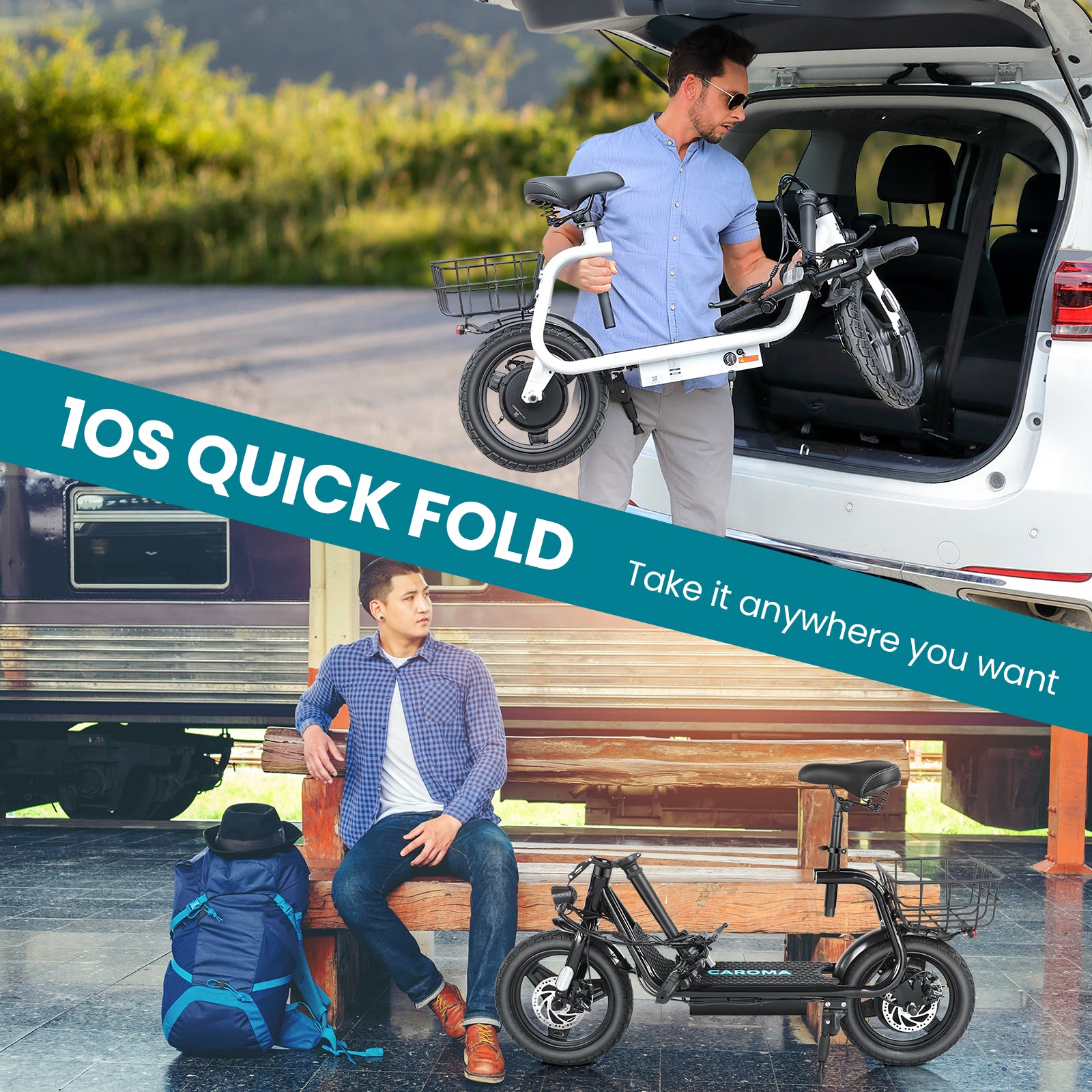 🌞The Caroma electric scooter is designed for urban commuting and mountain biking. The shock-absorbing system composed of front forks, fat tires and seats can absorb 90% of the ground impact force. The 20"*3" off-road grade fat tires can drive smoothly on various terrains such as mountains, sand roads, and snow roads.