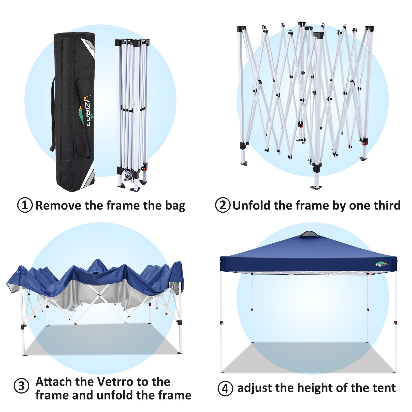 COBIZI pop up canopy can be set up in minutes. You can also leave the canopy tent on the frame and fold it easily. The 10x10 pop up canopy provides 100 square feet of shadow area. It is very suitable for outdoor leisure activities such as backyard, garden, family party, sports events, camping and barbecue. It will be the perfect shelter for you to have fun in the sun.