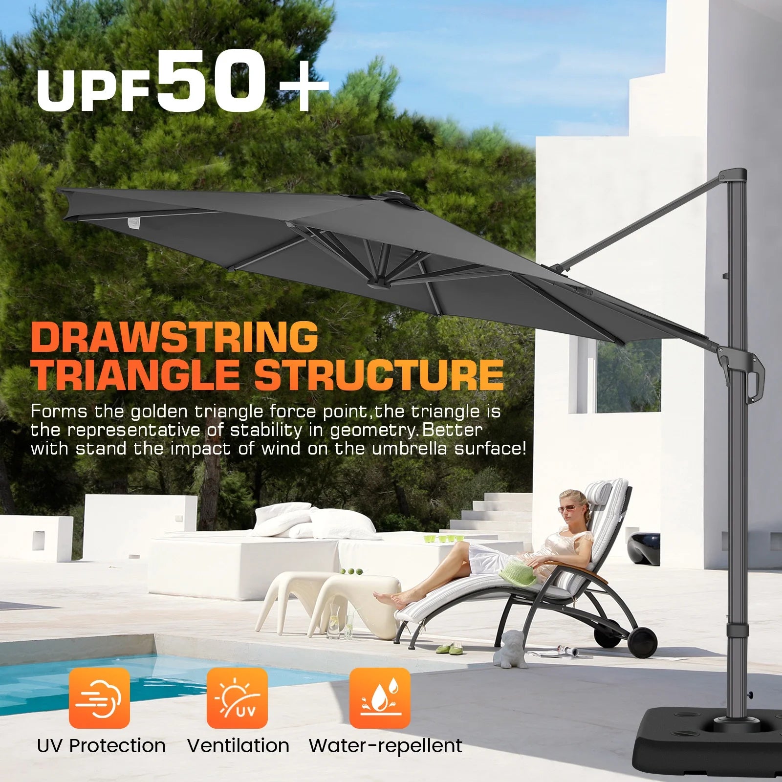 360-degree rotation-Its 360-degree rotation design allows you to rotate the umbrella to the appropriate position at any time as needed, without the need to frequently adjust the position of the base or furniture.The convenience of this flexibility allows you to get a full range of sun protection for different activities.