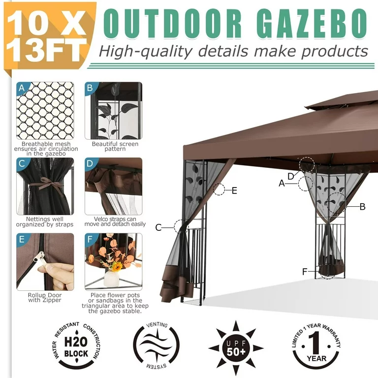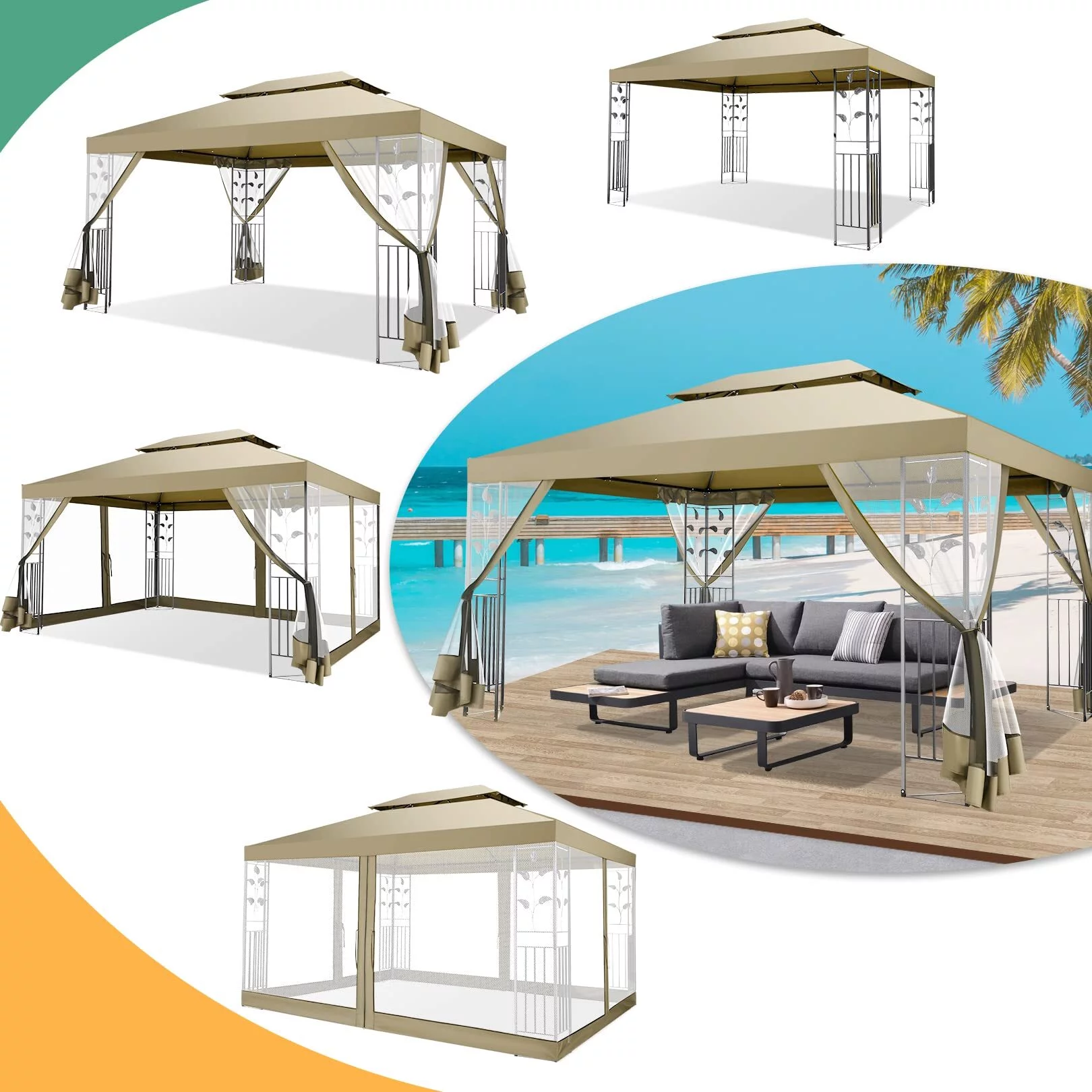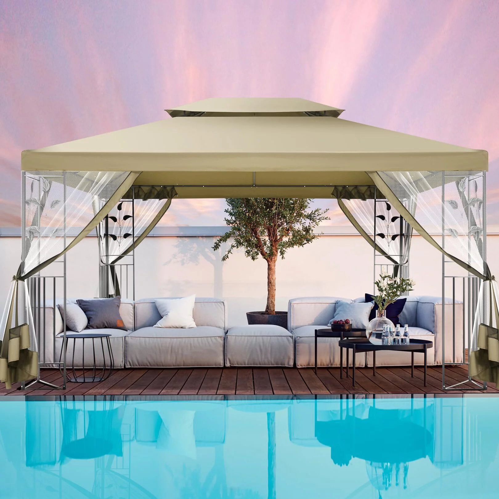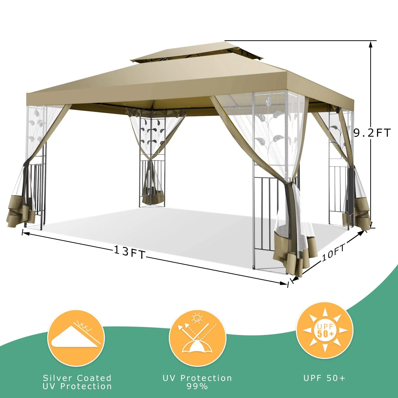 COBIZI 10x13 Outdoor Gazebo, Garden Tent for Patio Canopy with Leaf Screen Steel Frame and Mosquito Netting, Double Roof Canopy Tent for Party, Deck, Backyard, Garden and Lawns, Khaki