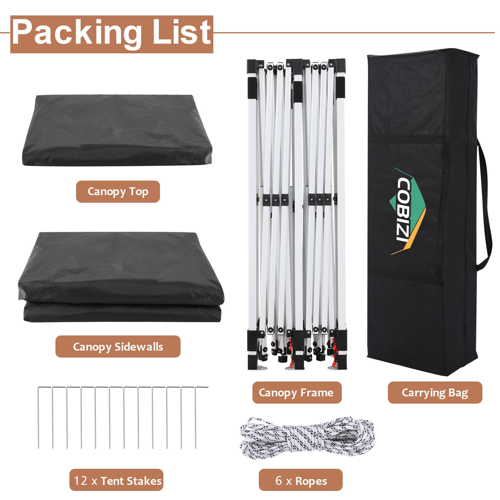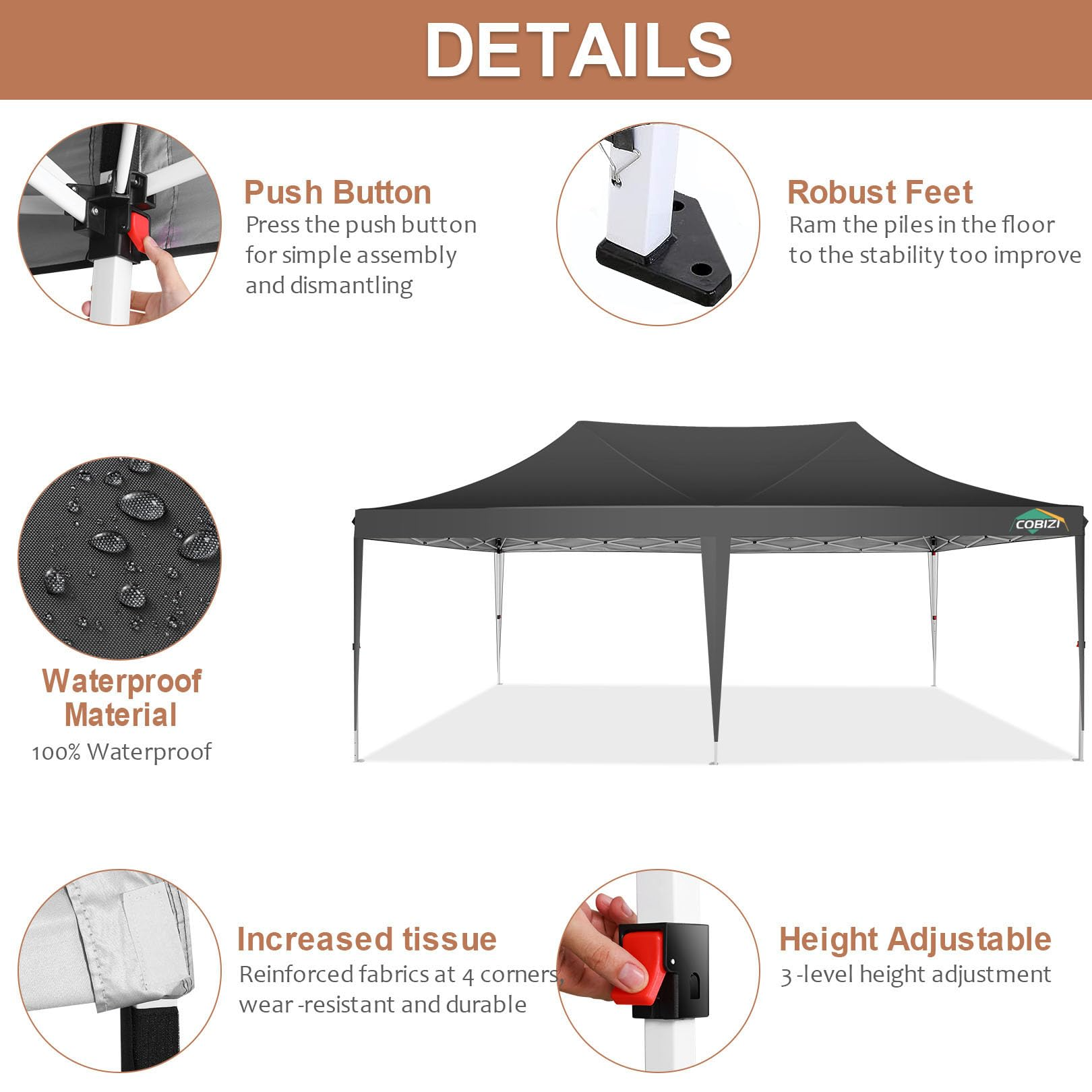✅【Upgrade Structure & Material】 COBIZI 10x20 Pop up Canopy has a strong structure and frame made of powder-coated and high-strength steel pipe, which is durable and rustproof. The fabric is made of 210D Oxford fabric with double PU coating, UPF 50+, which can block 99% of UV rays. All seams are taped to prevent leaks ensuring 100% waterproof.