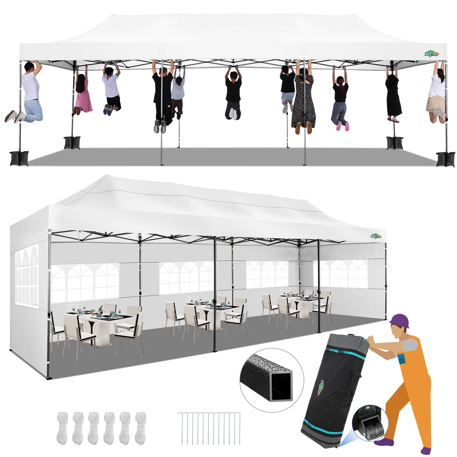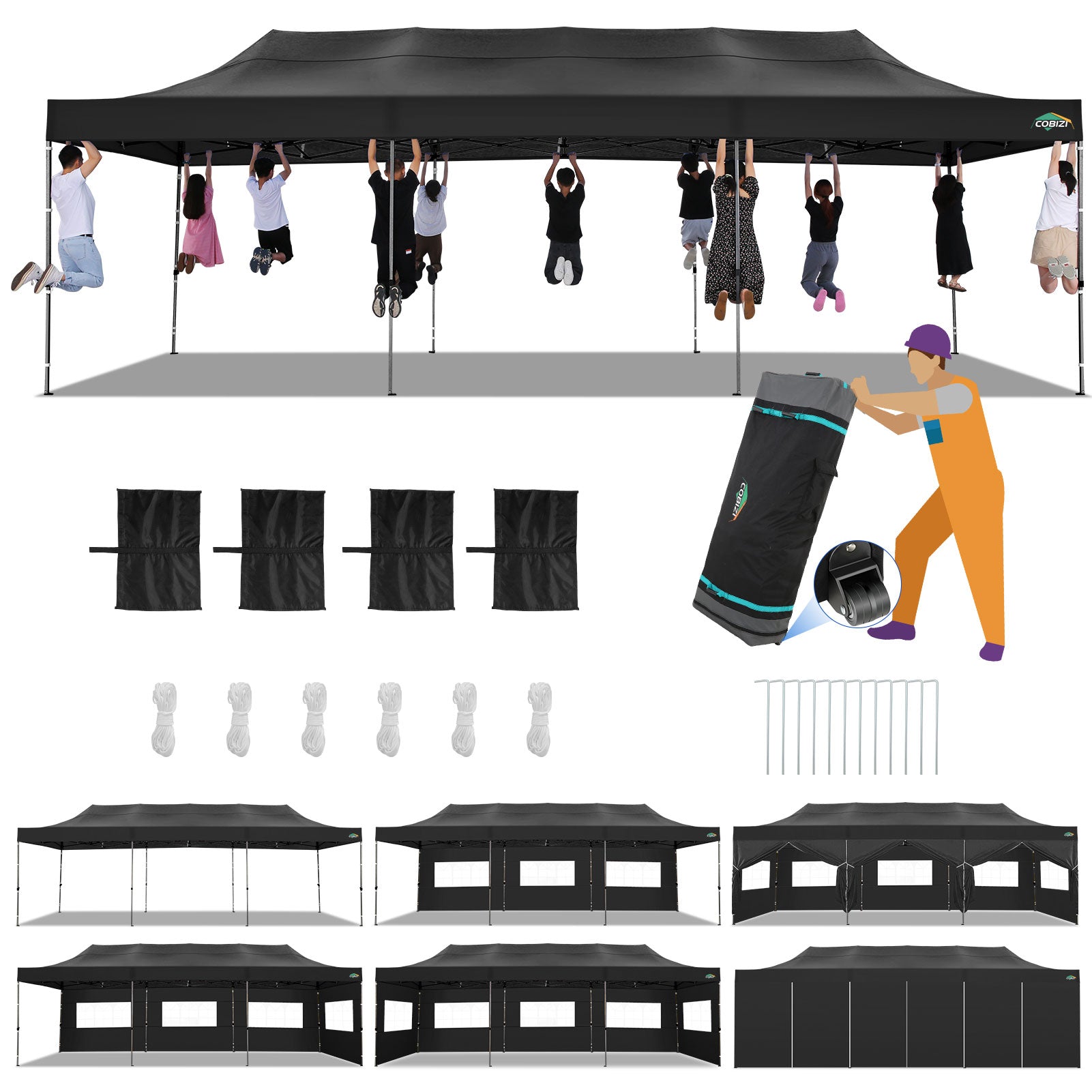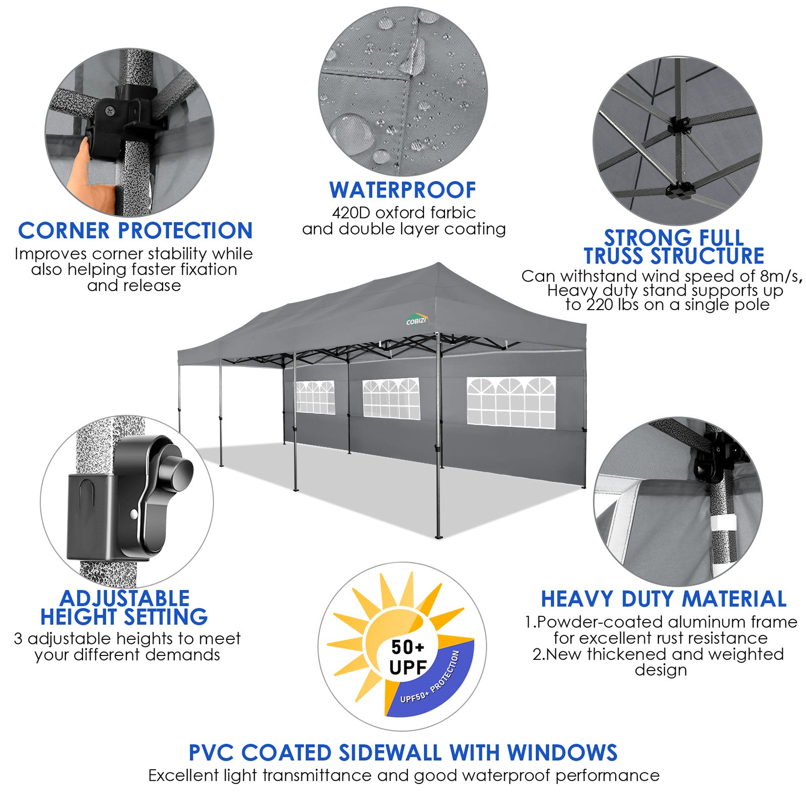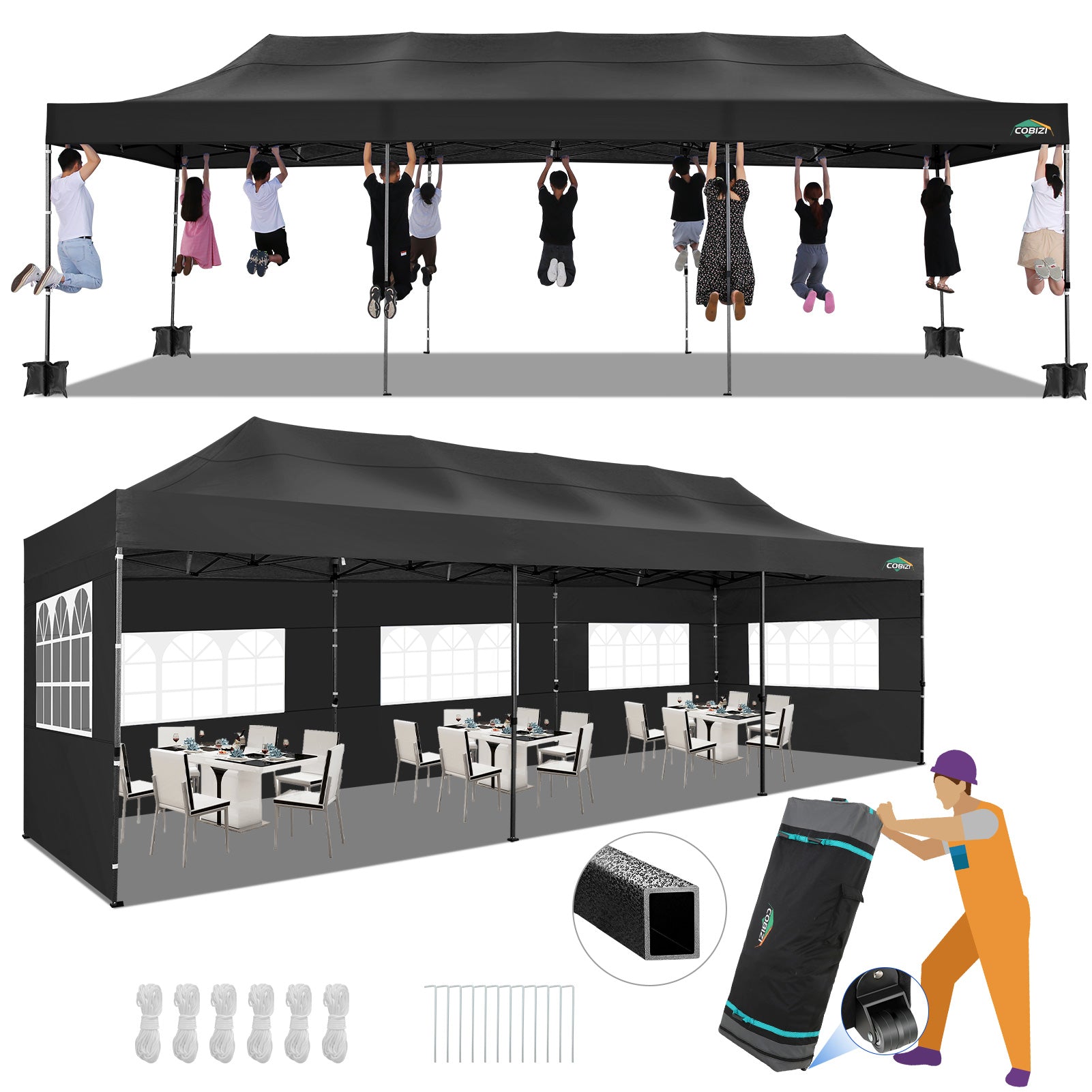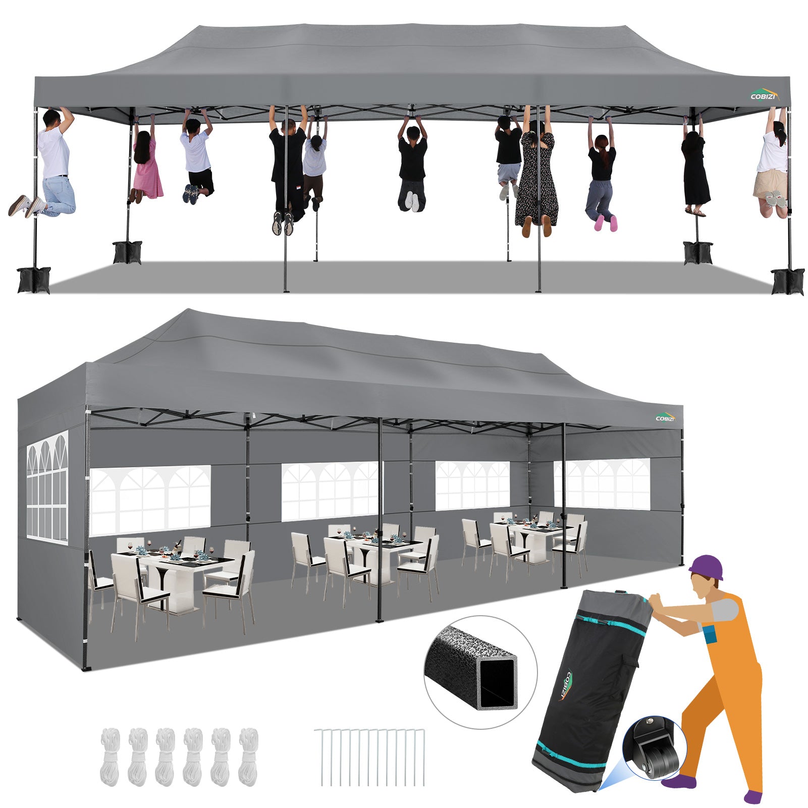 COBIZI 10x30 Party tent is made of 420D high quality Oxford with two layers of PU coating, UPF 50+, blocks 99% of the sun's rays. Seams are fully sealed to prevent water leakage, 100% waterproof. Waterproof pressure is 2.1psi, while the waterproof pressure of general tents is only 1.1psi. 8 PU coated removable sidewalls are connected by a whole strip of Velcro and zipper for tying frame top and legs. You can install different number of sidewalls according to your needs, and adjust heavy duty canopy in 3 different heights (86", 90", 94") with thumb button to provide enough headspace. Large Wedding Party tent for 25-30 people!