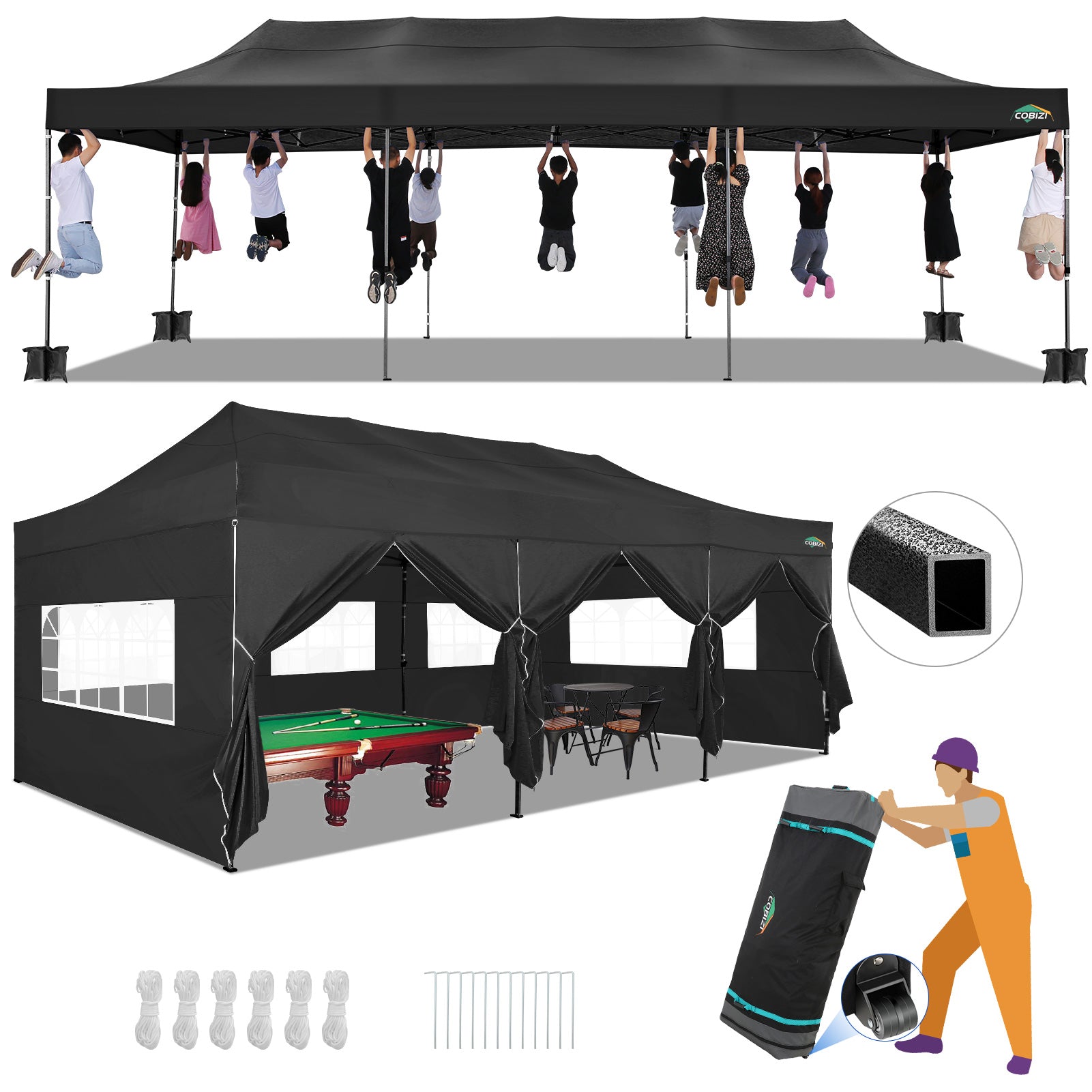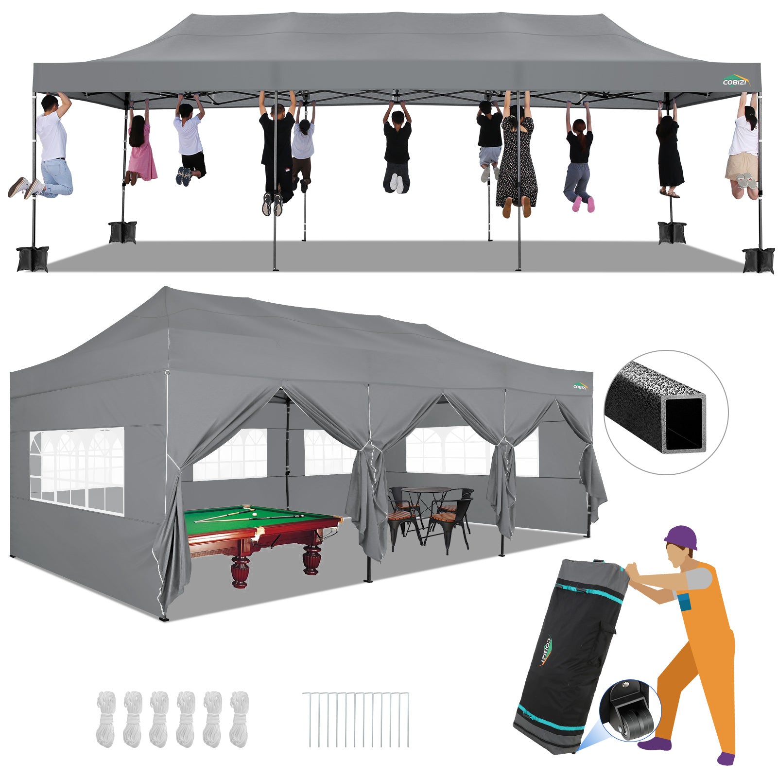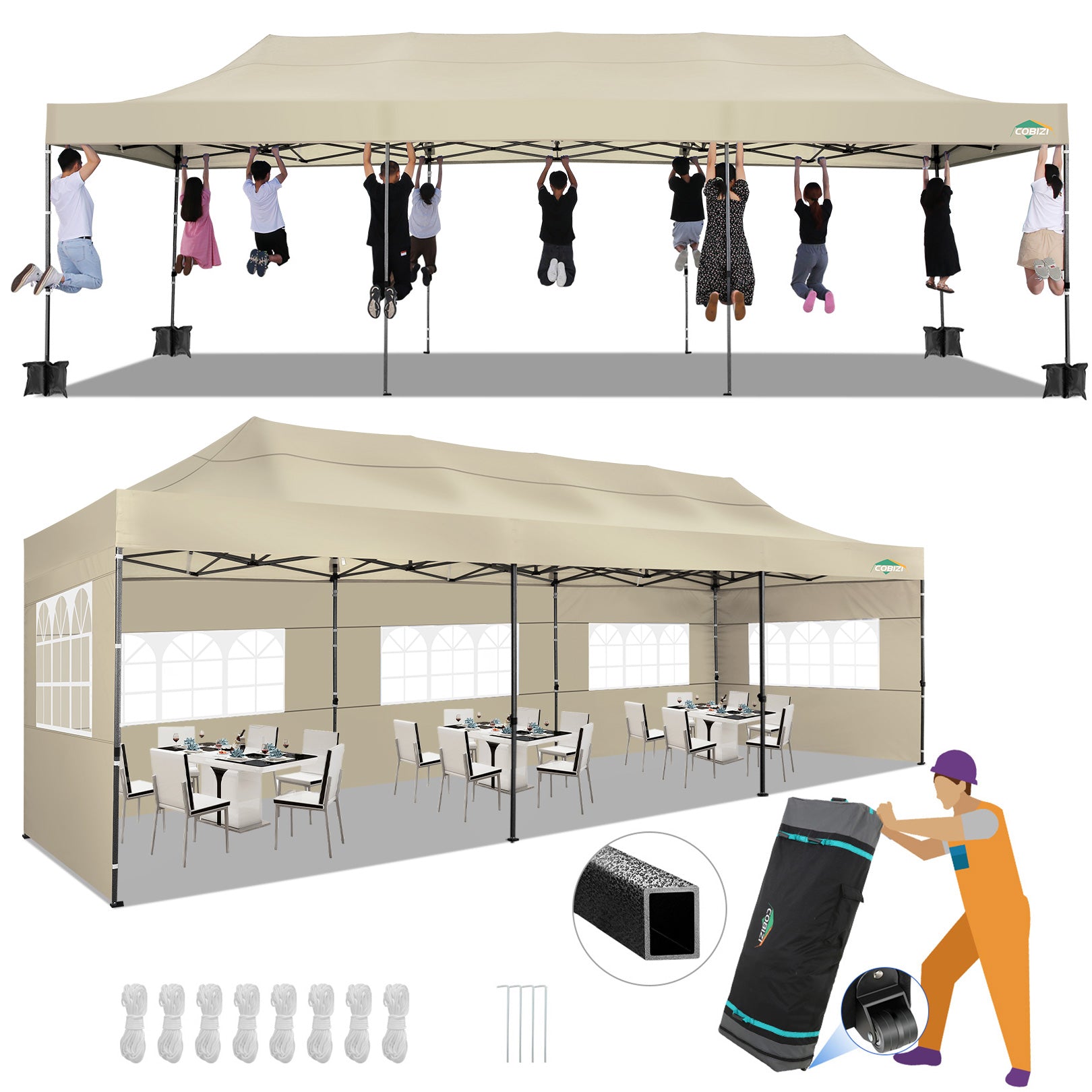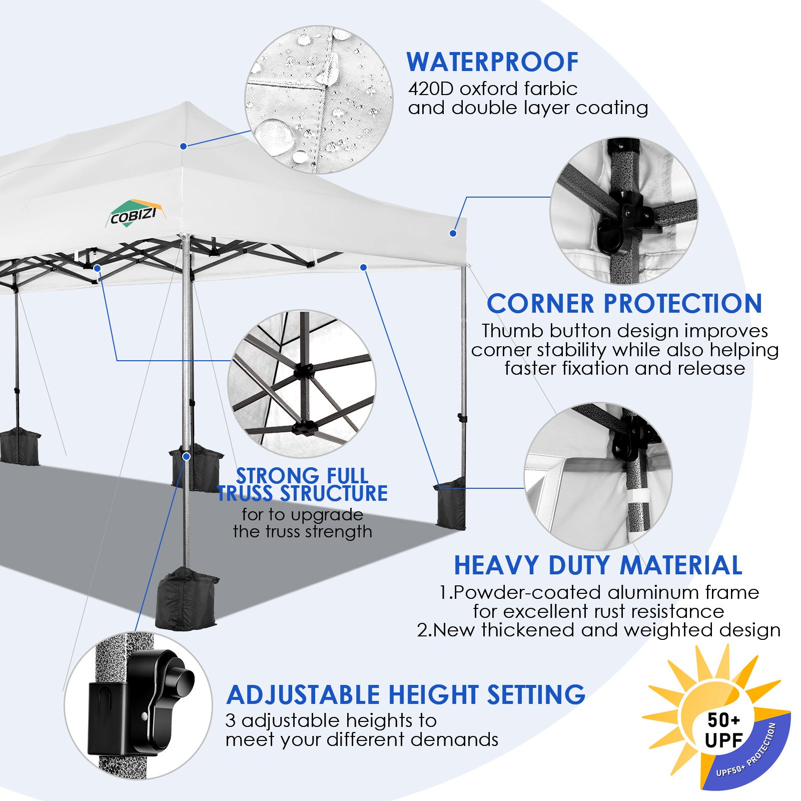 COBIZI 10x30 Party tent is made of 420D high quality Oxford with two layers of PU coating, UPF 50+, blocks 99% of the sun's rays. Seams are fully sealed to prevent water leakage, 100% waterproof. Waterproof pressure is 2.1psi, while the waterproof pressure of general tents is only 1.1psi. 8 PU coated removable sidewalls are connected by a whole strip of Velcro and zipper for tying frame top and legs. You can install different number of sidewalls according to your needs, and adjust heavy duty canopy in 3 different heights (86", 90", 94") with thumb button to provide enough headspace. Large Wedding Party tent for 25-30 people!