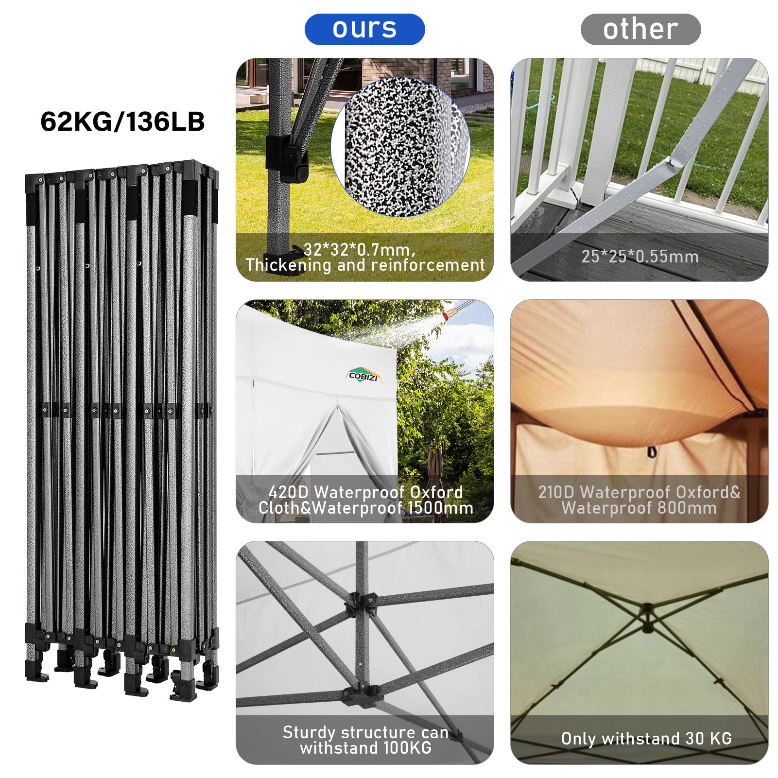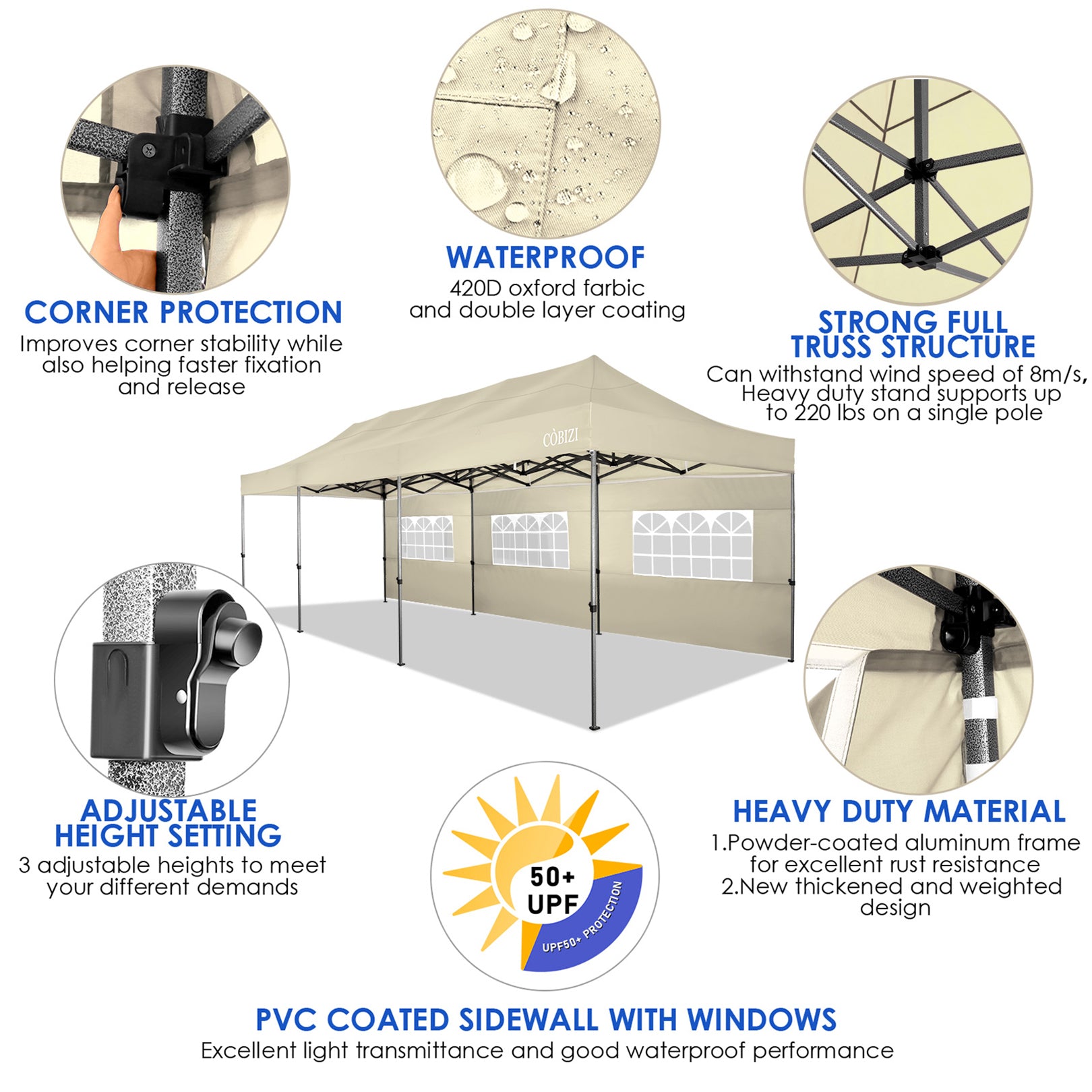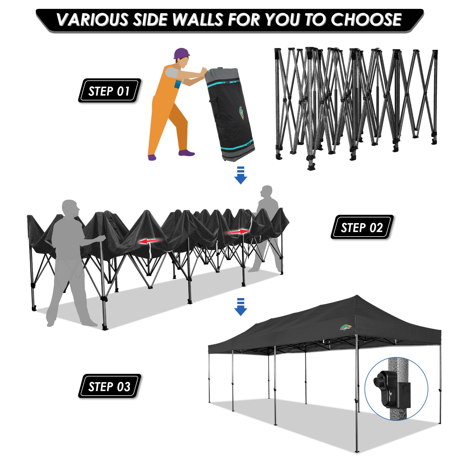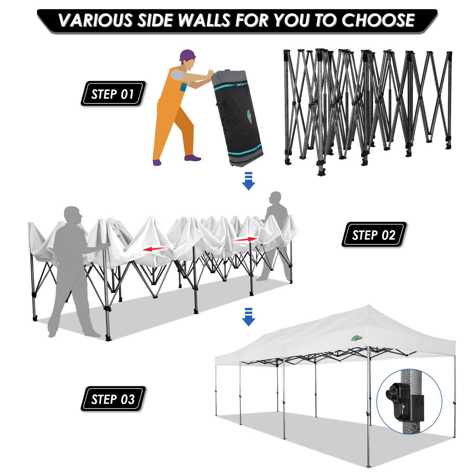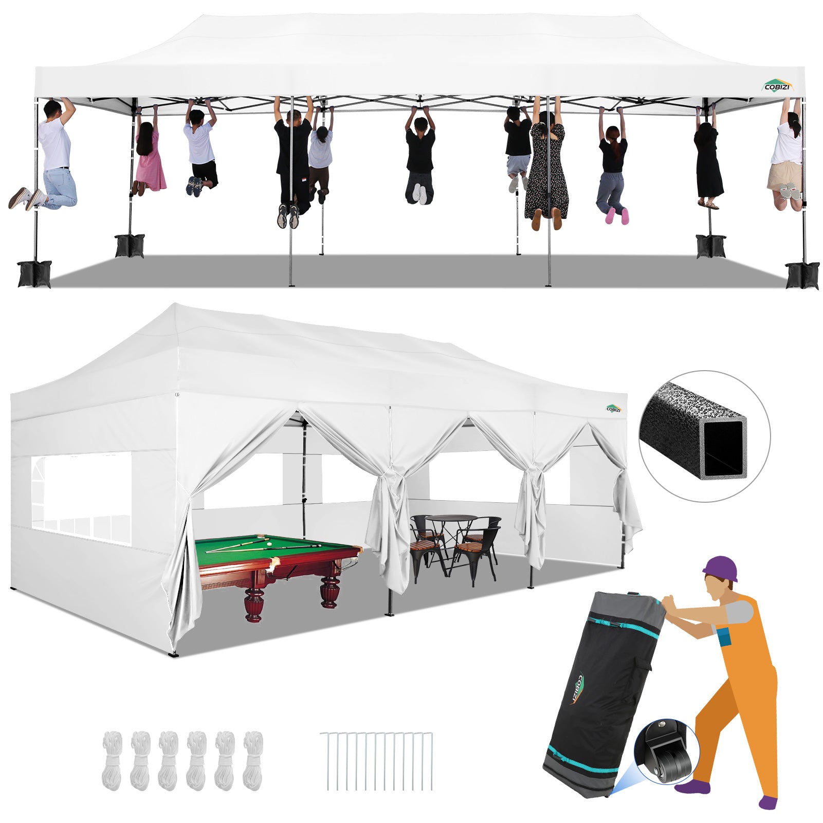 COBIZI 10x30 Party tent is made of 420D high quality Oxford with two layers of PU coating, UPF 50+, blocks 99% of the sun's rays. Seams are fully sealed to prevent water leakage, 100% waterproof. Waterproof pressure is 2.1psi, while the waterproof pressure of general tents is only 1.1psi. 8 PU coated removable sidewalls are connected by a whole strip of Velcro and zipper for tying frame top and legs. You can install different number of sidewalls according to your needs, and adjust heavy duty canopy in 3 different heights (86", 90", 94") with thumb button to provide enough headspace. Large Wedding Party tent for 25-30 people!