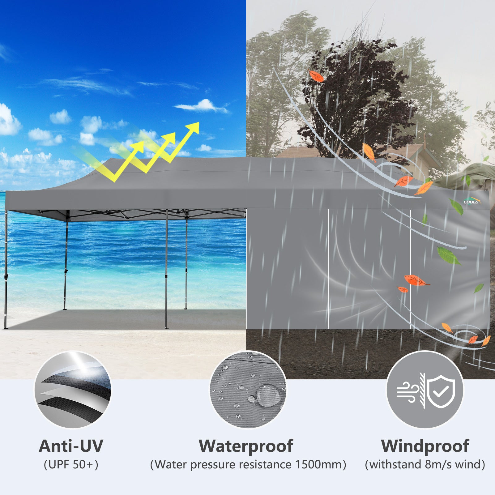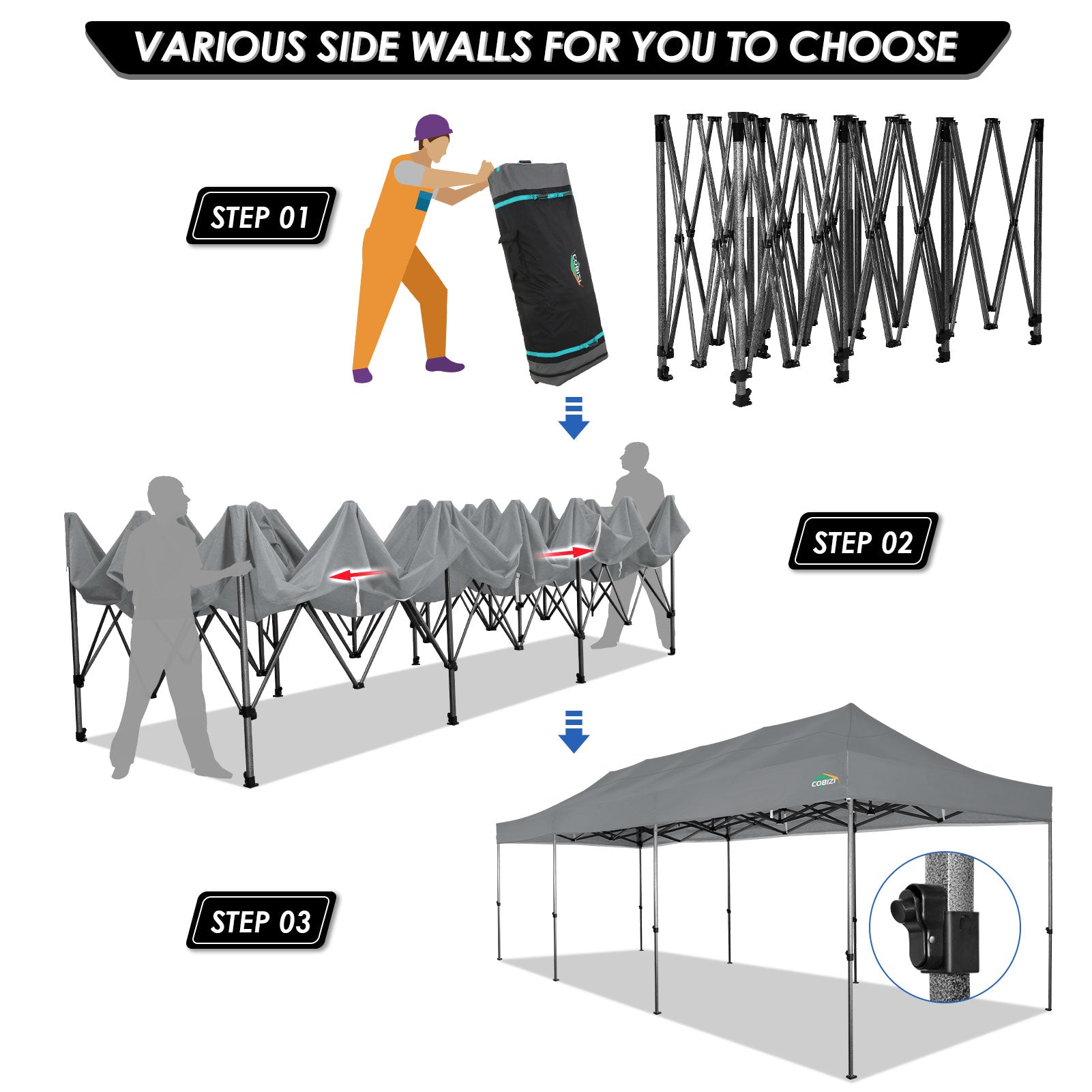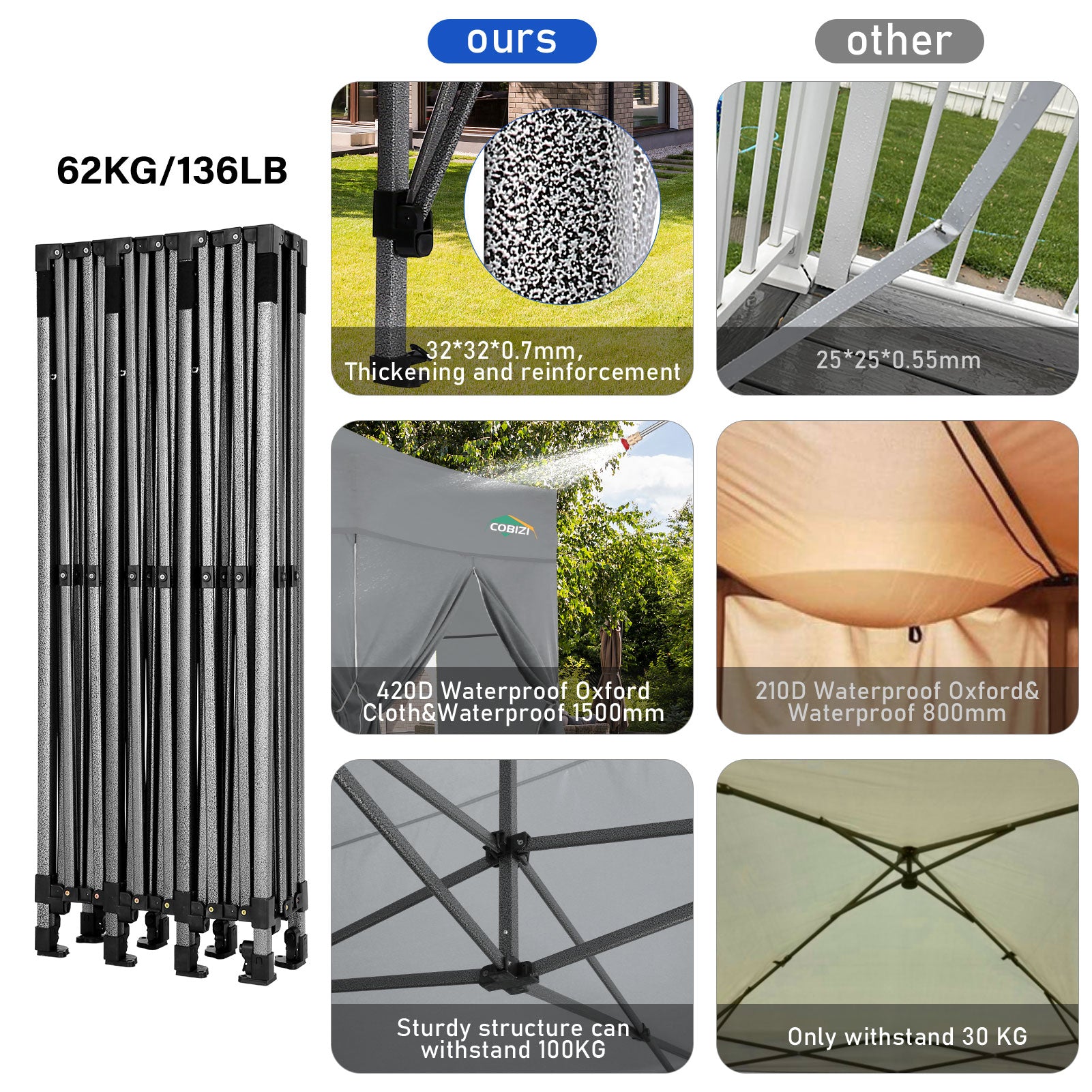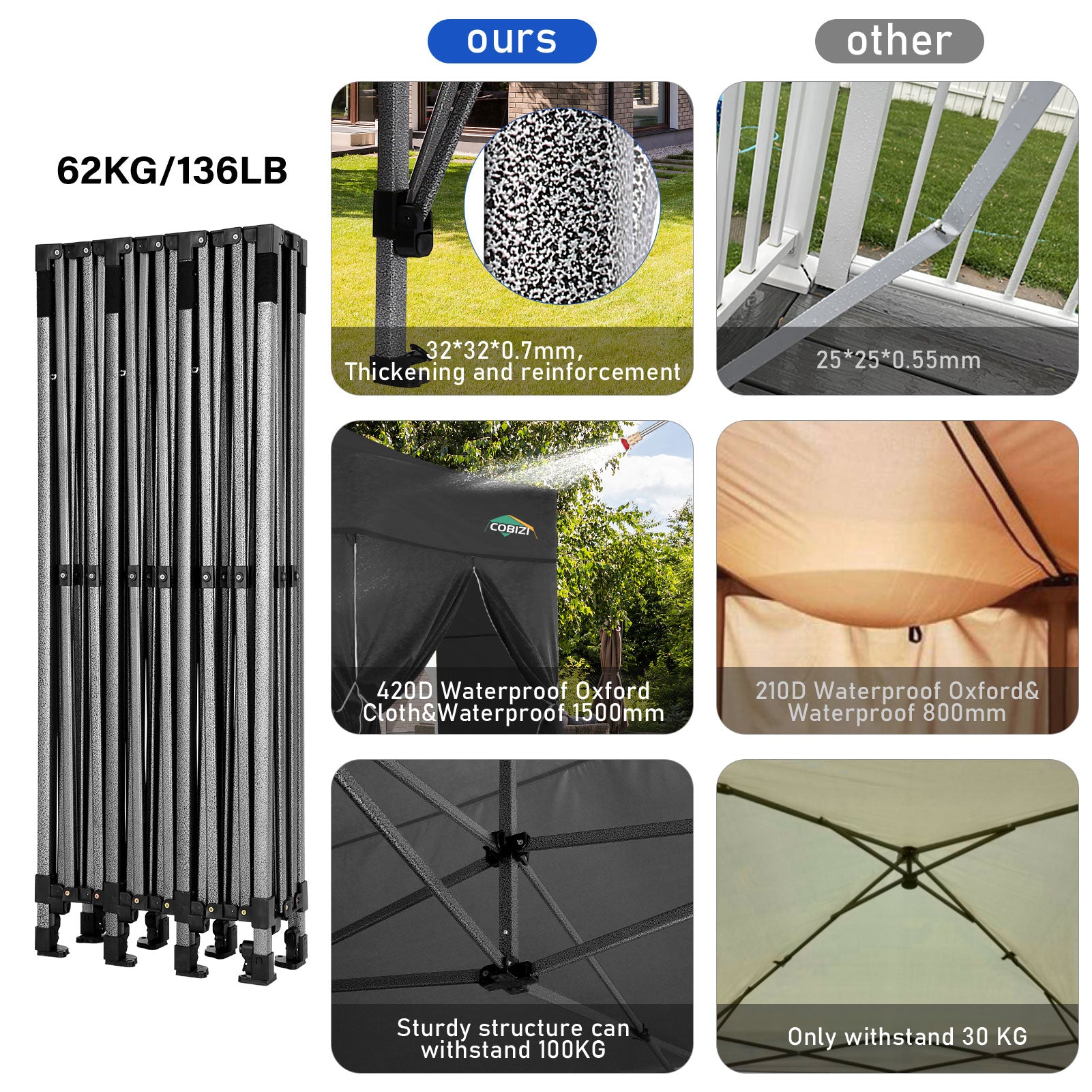 COBIZI 10x30 Party tent is made of 420D high quality Oxford with two layers of PU coating, UPF 50+, blocks 99% of the sun's rays. Seams are fully sealed to prevent water leakage, 100% waterproof. Waterproof pressure is 2.1psi, while the waterproof pressure of general tents is only 1.1psi. 8 PU coated removable sidewalls are connected by a whole strip of Velcro and zipper for tying frame top and legs. You can install different number of sidewalls according to your needs, and adjust heavy duty canopy in 3 different heights (86", 90", 94") with thumb button to provide enough headspace. Large Wedding Party tent for 25-30 people!