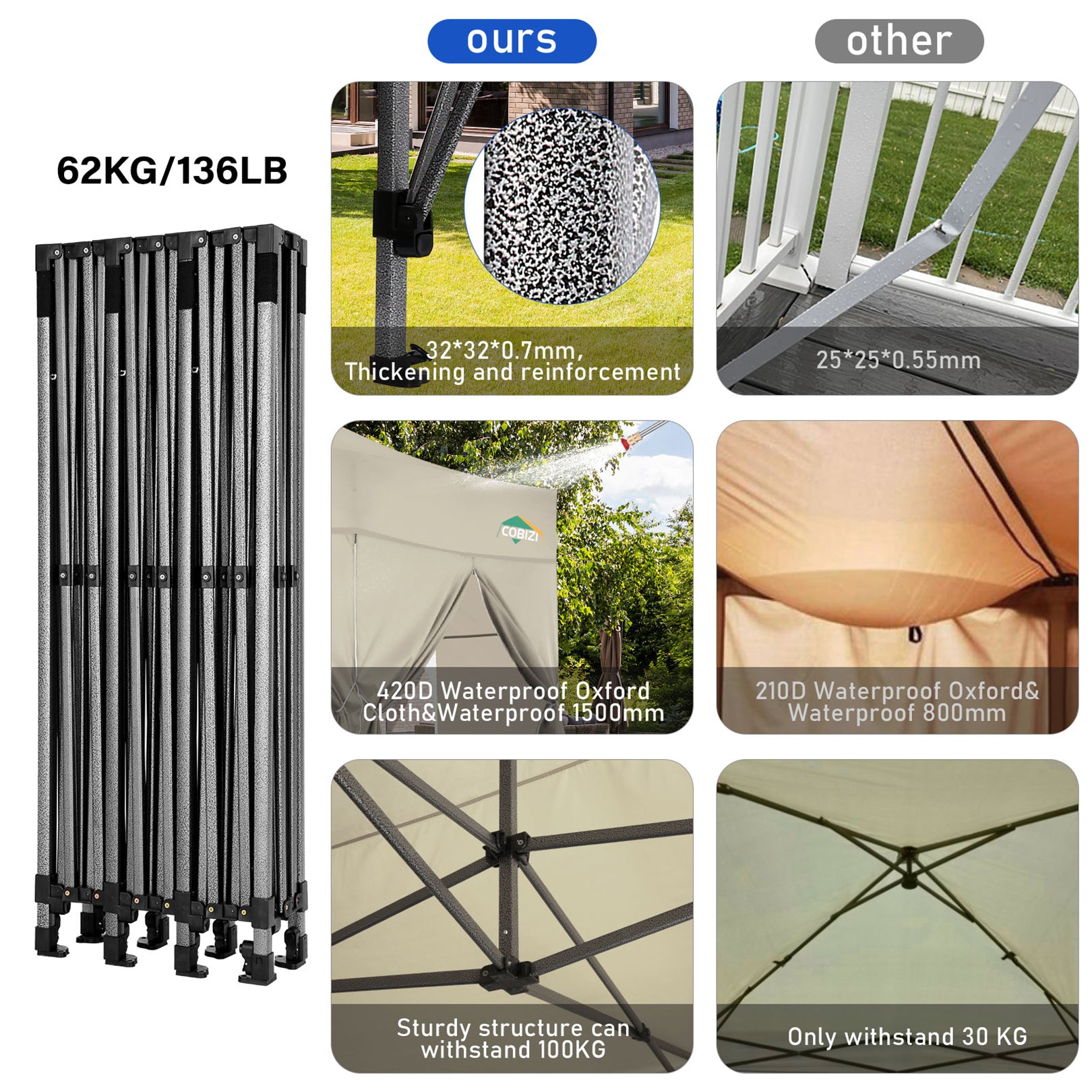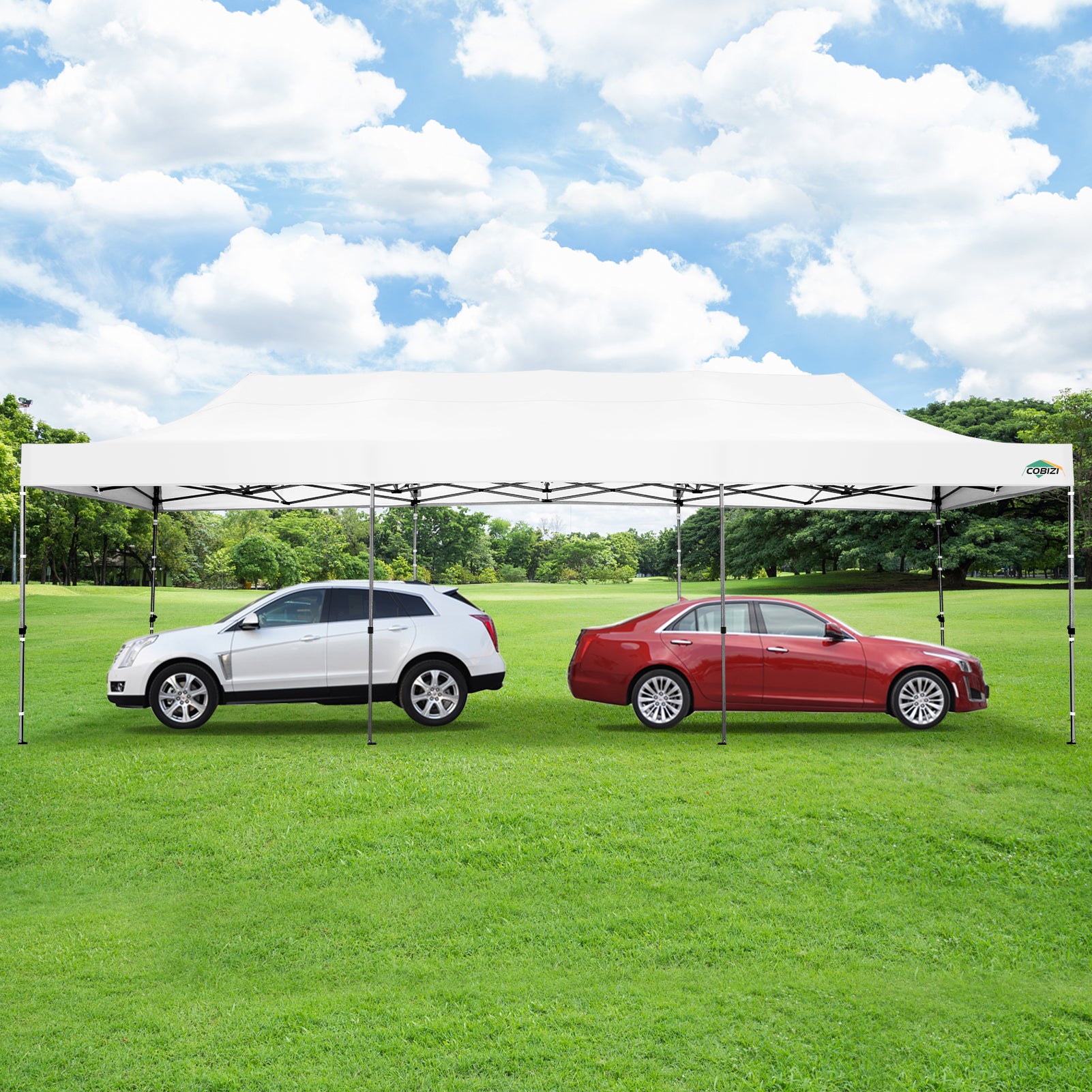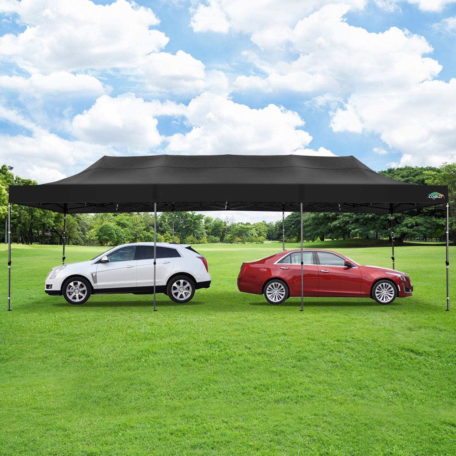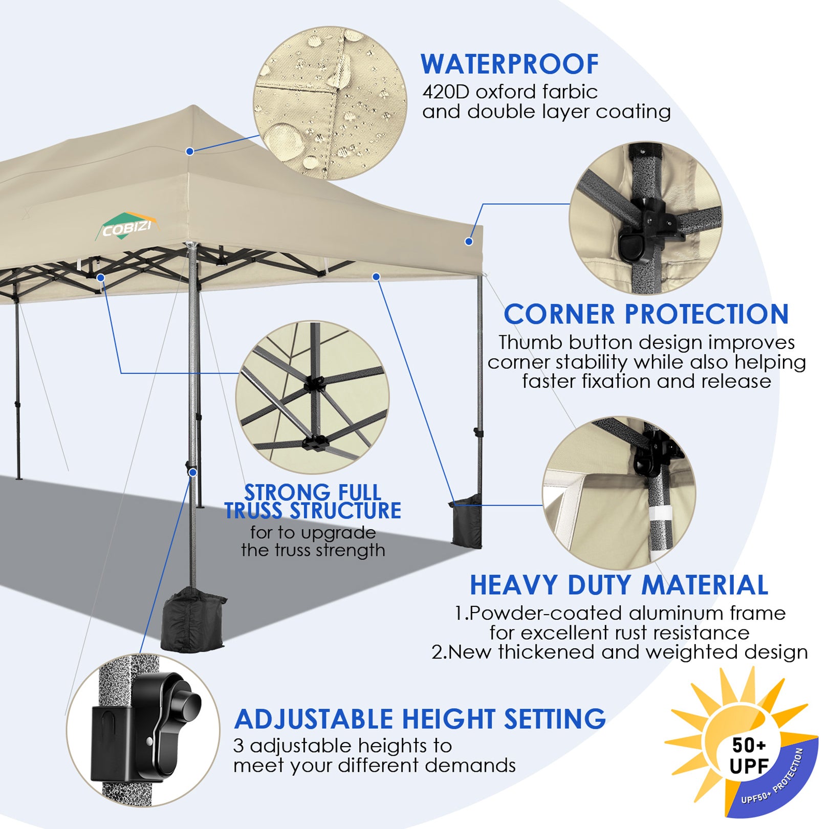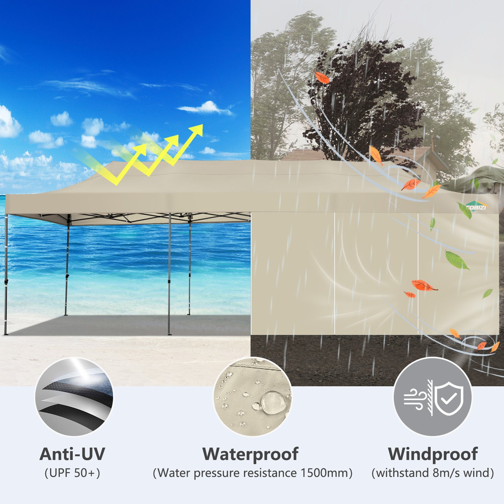 COBIZI 10x30 Party tent is made of 420D high quality Oxford with two layers of PU coating, UPF 50+, blocks 99% of the sun's rays. Seams are fully sealed to prevent water leakage, 100% waterproof. Waterproof pressure is 2.1psi, while the waterproof pressure of general tents is only 1.1psi. 8 PU coated removable sidewalls are connected by a whole strip of Velcro and zipper for tying frame top and legs. You can install different number of sidewalls according to your needs, and adjust heavy duty canopy in 3 different heights (86", 90", 94") with thumb button to provide enough headspace. Large Wedding Party tent for 25-30 people!
