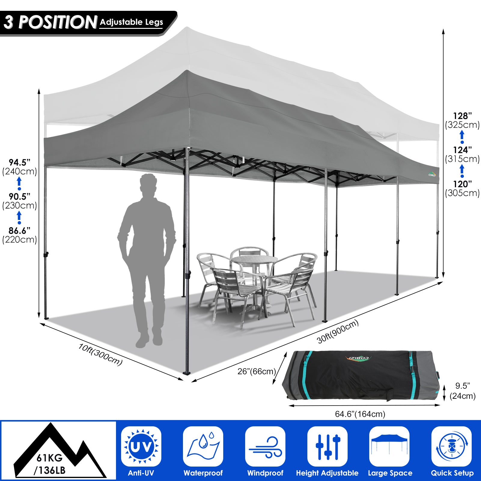 【Upgrade Heavy Duty Frame】10x30 commercial canopy frame is full truss construction with powder coated, durable and rustproof. The pipe diameter is 1.26'' and the wall thickness is 0.03''. Intermediate support pole construction can hold up to 220 lbs on a single pole and can withstand up to level 4 wind/18 mph
