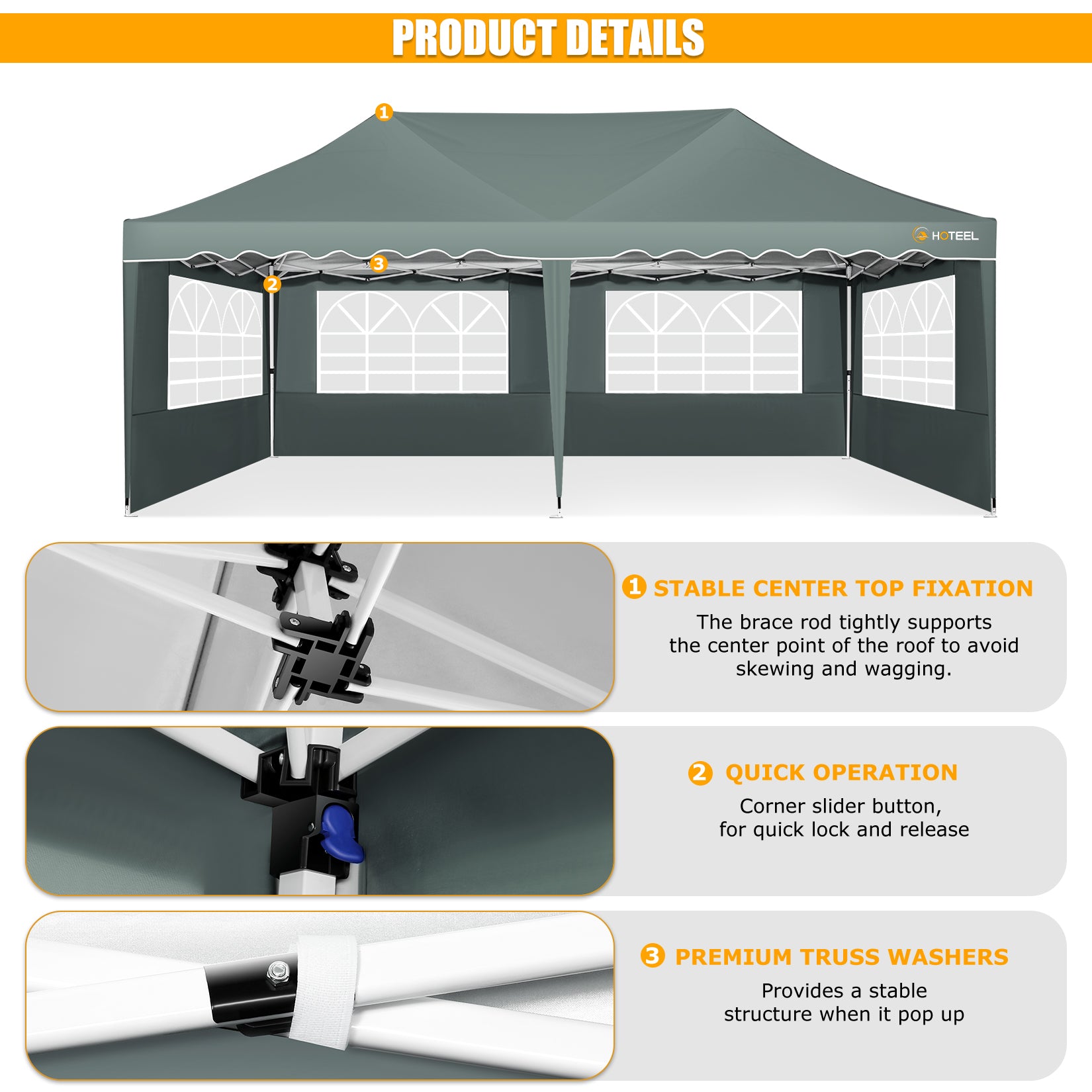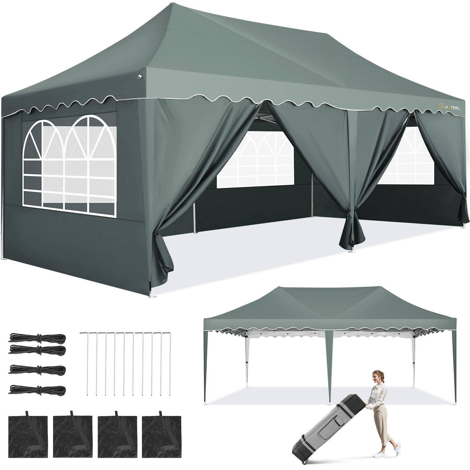HOTEEL Canopy Tent 10X20 Pop-up Canopy with 6 Removable Sidewalls and Wheeled Bag& Curled Edge ,Outdoor Event Instant and Portable Tents,for Parties, Weddings, Camping and Beaches,Grey Green