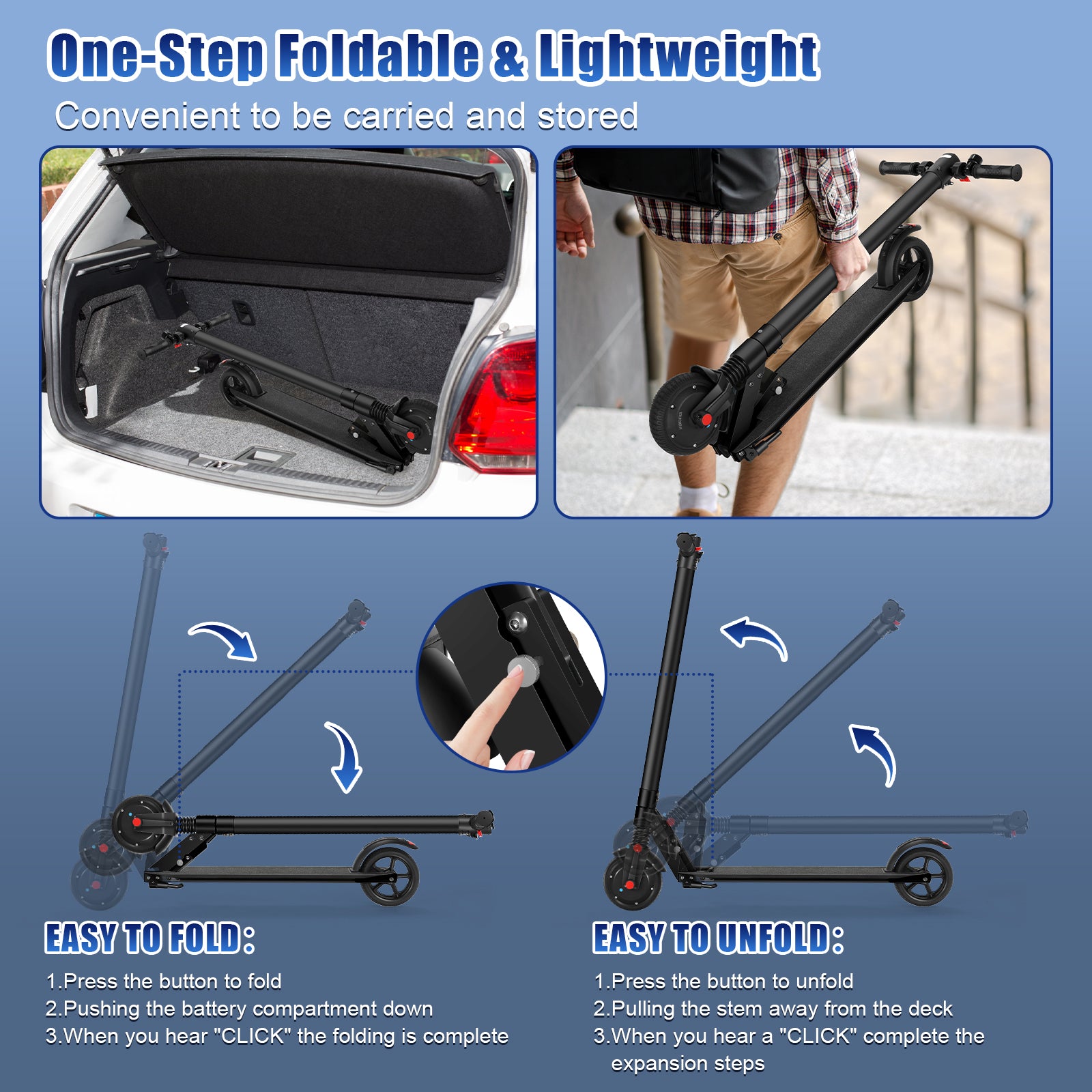 【Foldable & Best Gift Choice】HOTEEL scooter for adults can be folded down to the size of 45.7*19.7*20.5 inches, which is easy to store in the car, office, elevators, and other compact spaces. The front stem can be snapped onto the rear fender, quick release-and-fold system requires only 3 effortless steps.