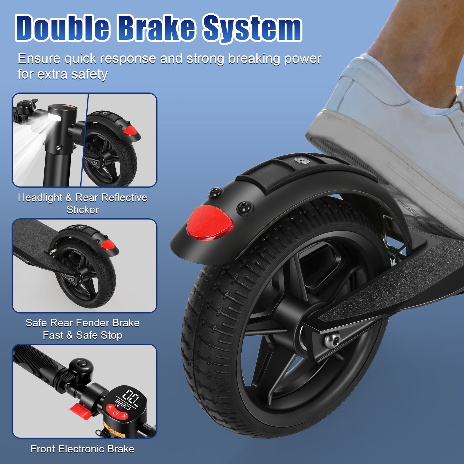 【Auto Light System】E66 PRO scooter for adults feature a 3W LED headlight, will illuminate automatically in the dark, pedal side light and taillight flash when braking, which can enhances rider's safety at night riding. Dual braking system achieves efficient braking, greatly enhancing safety to give you strong confidence during every single ride. Non-zero start of the 20mph motorized scooter also ensures safety when starting.