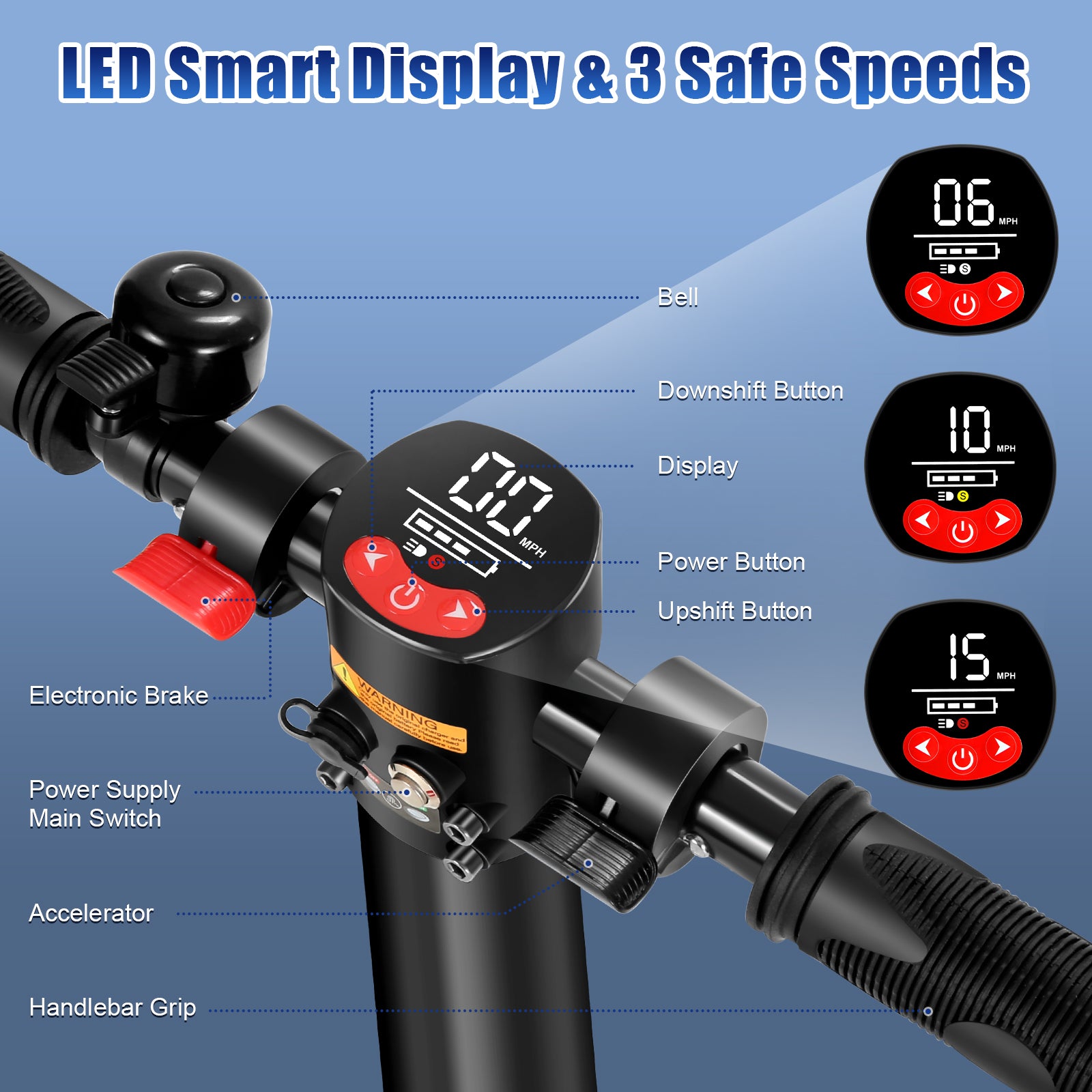 - 3 Speed Gear: S=20MPH D=15MPH E=10MPH, 3-speed modes to meet your daily travel