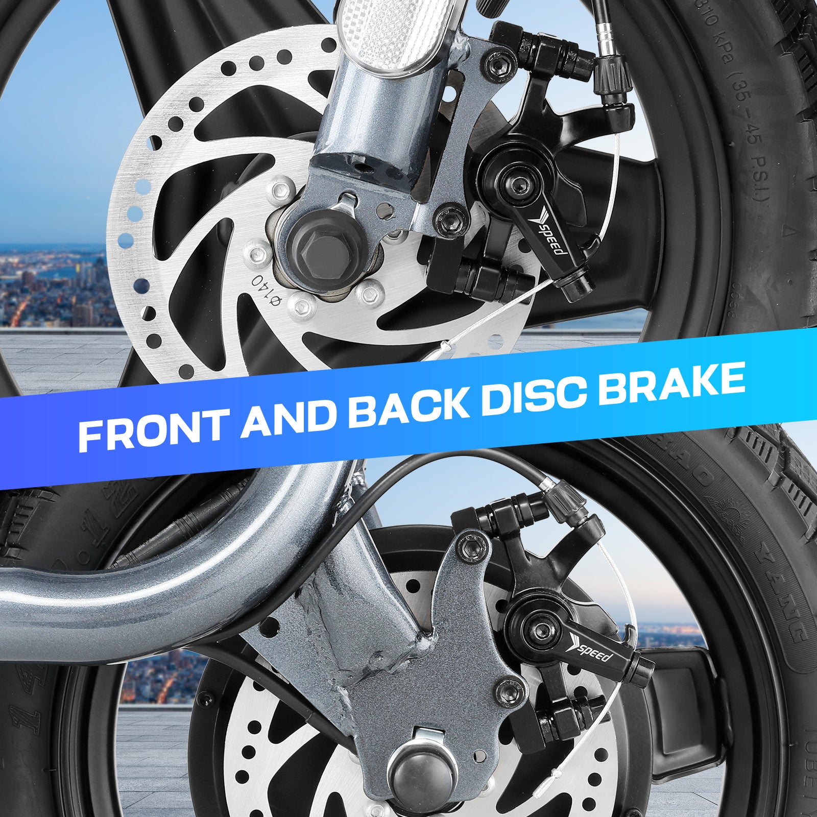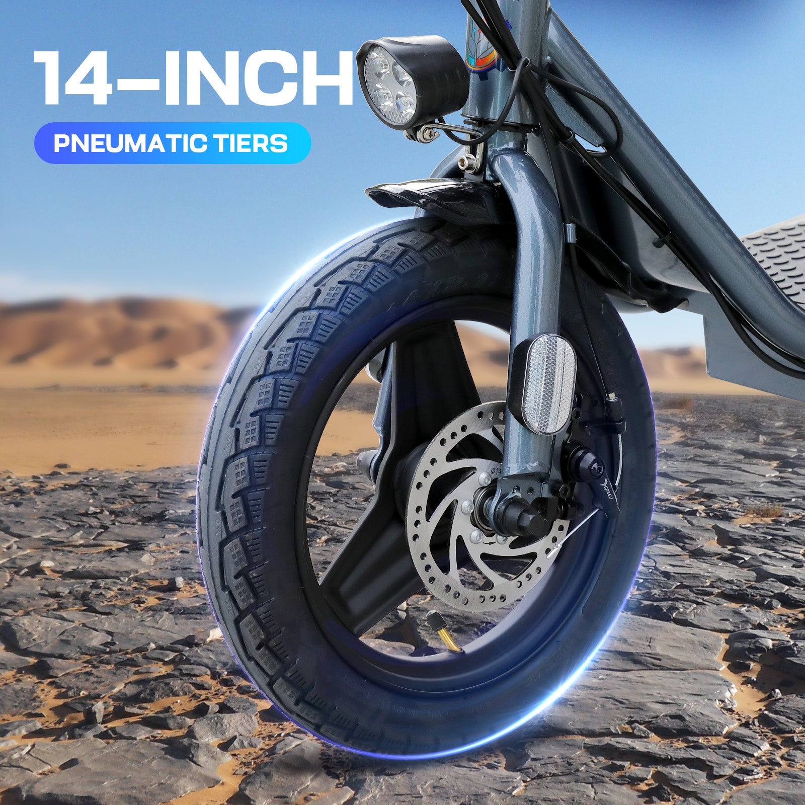 【Off-road Suspension System】The electric scooter is equipped with 2 front fork spring shock absorbers, 2 seat shock-absorbing springs and 2 puncture-resistant 20"X3" fat tires, which can effectively absorb ground impact while riding and provide better control. Combined with front and rear mechanical disc brakes and an EABS system, you can enjoy a comfortable ride and powerful braking, even on steep slopes, rough terrain, or other extreme terrain.